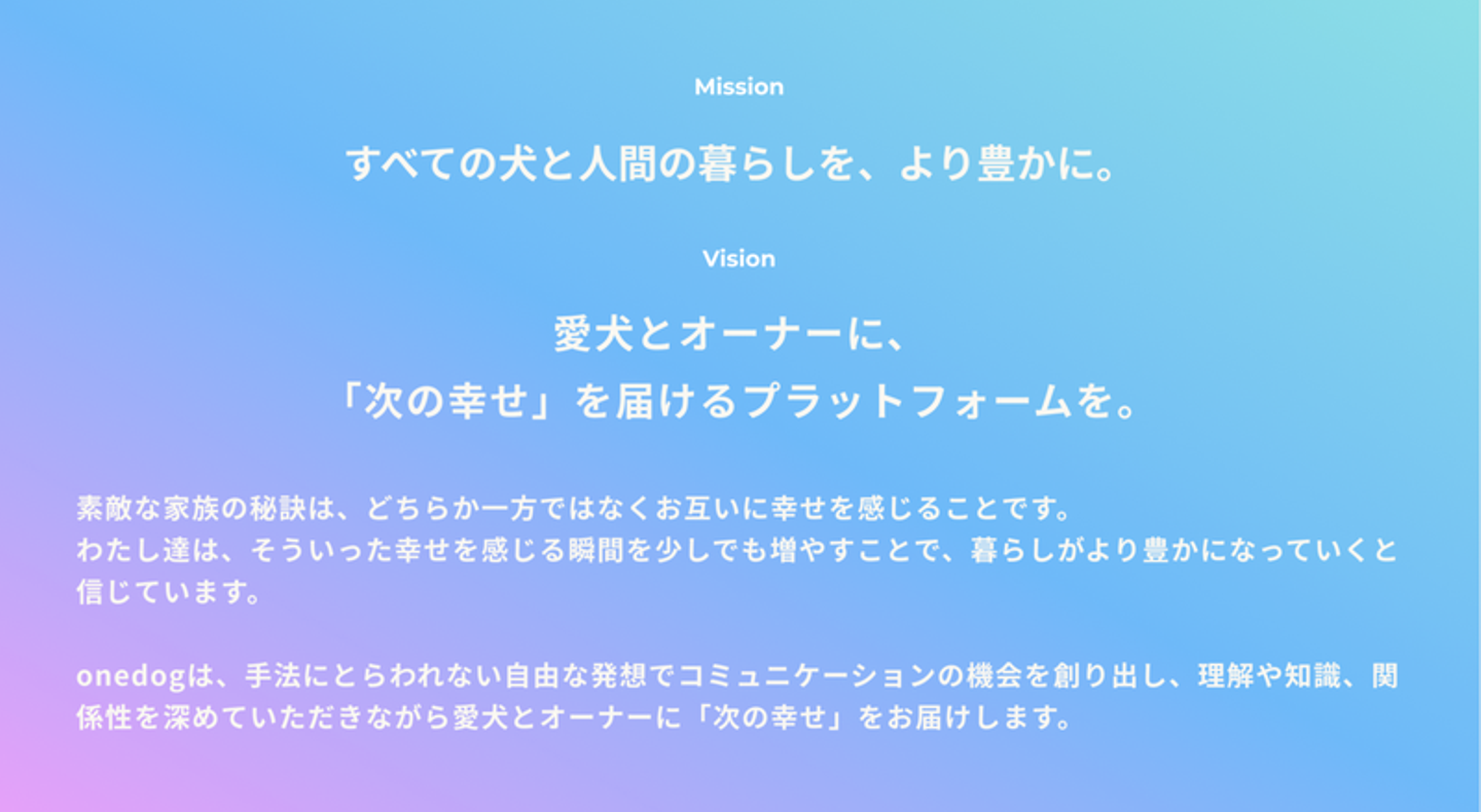 金井さんは、前職でお世話になっただけでなく、ご家庭で犬を飼っており、サービスにも興味を持ってくれていたためご相談させていただき、デザイナー兼ユーザー目線でミッション・ビジョンのレビューをしてもらうことになりました。レビューを通じて、表現・言い回しについて指摘してもらうだけでなく、「なぜこの表現をしないか」といった、やらない理由も考えながら更に磨き上げることができました。