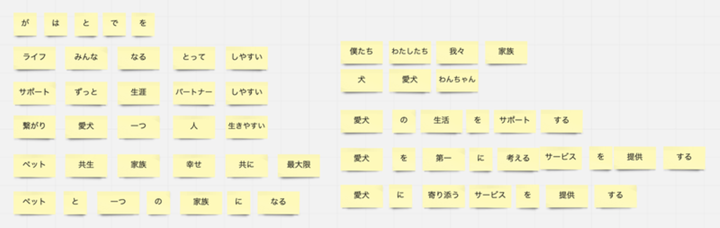 ブレストを始める前に、サービスの「これまで」と「これから」について詳しく共有しました。ペット市場や課題、リリース当初のコンセプト・設計思想などをはじめ、実際にサービスを使ってくれている方や愛犬家の方々に実施したアンケートやインタビューの調査結果を通じての考察なども共有しました。弊社には入社1年未満の新しいメンバーが多く、これらを共有することで、サービスの全体感やこれまでのサービス開発の文脈を知ってもらい、議論を無駄なくムラなく進めることができました。