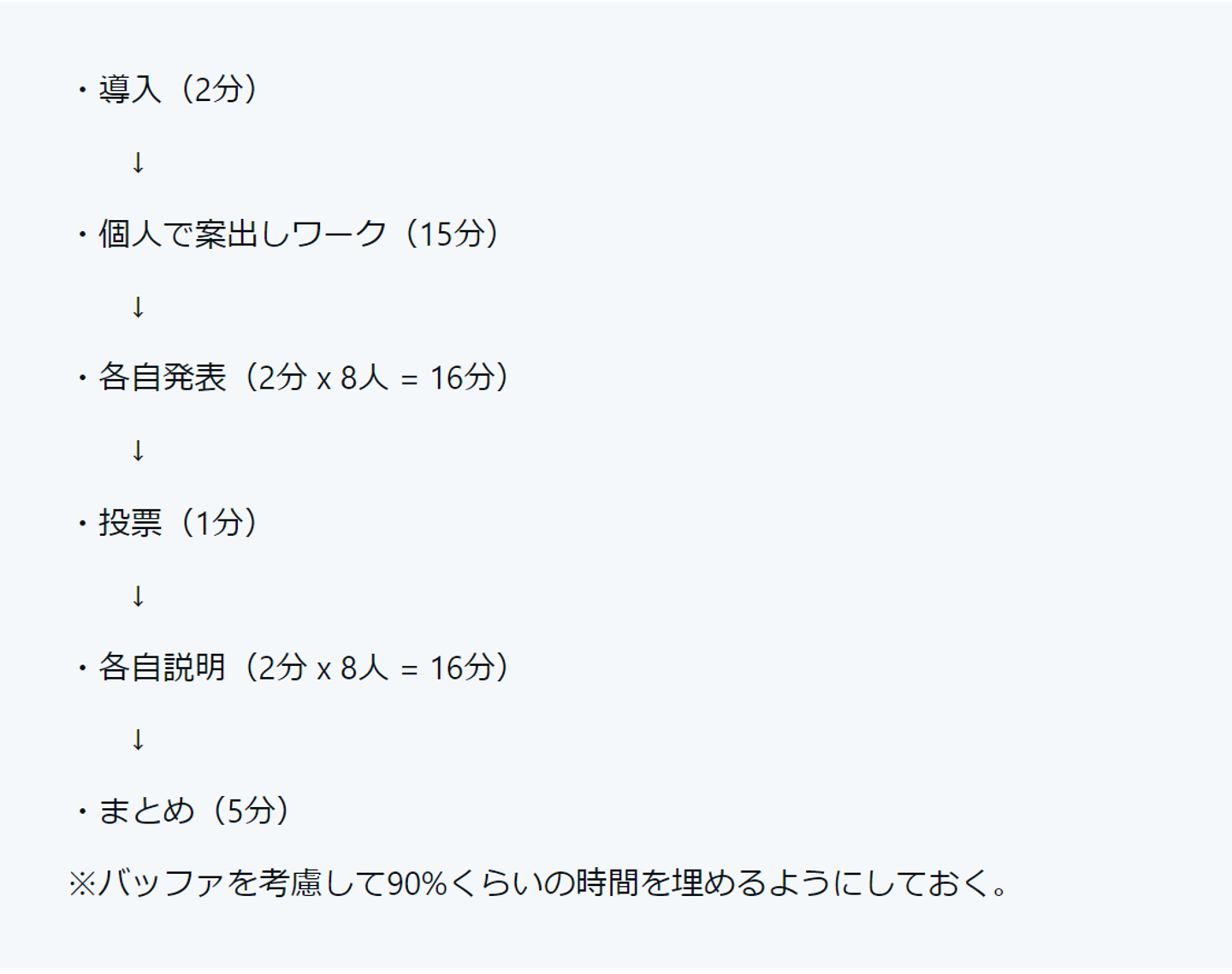 このブレストは1時間1セットで発散→収束を行うワークにしました。ワークの進め方や時間配分はこちらです。