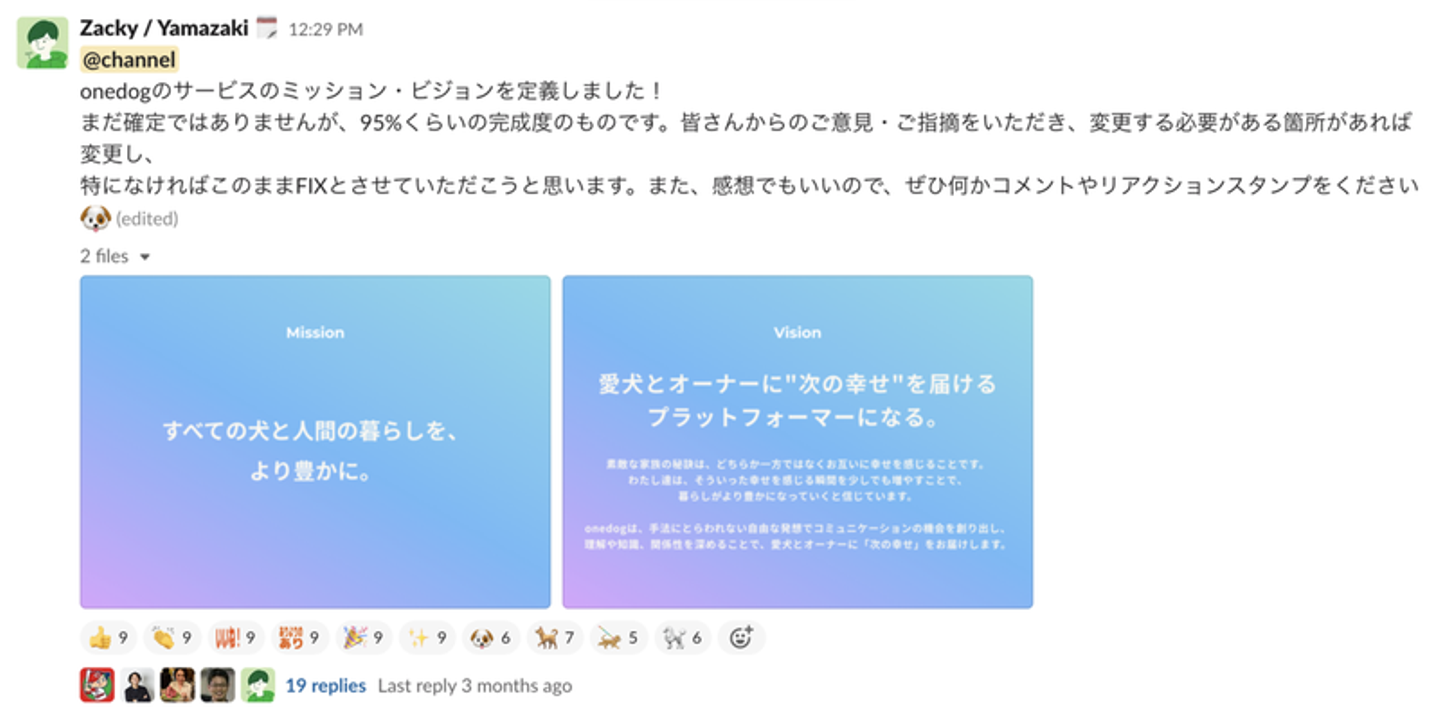 実際にメンバーからもいくつか指摘をもらうことができ、更にブラッシュアップすることができました。また、この共有では意見や指摘だけでなく、感想やスタンプなどリアクションを求めるようにして、社内メンバー間での合意形成やワクワクの醸成にもつながるようにしました。
