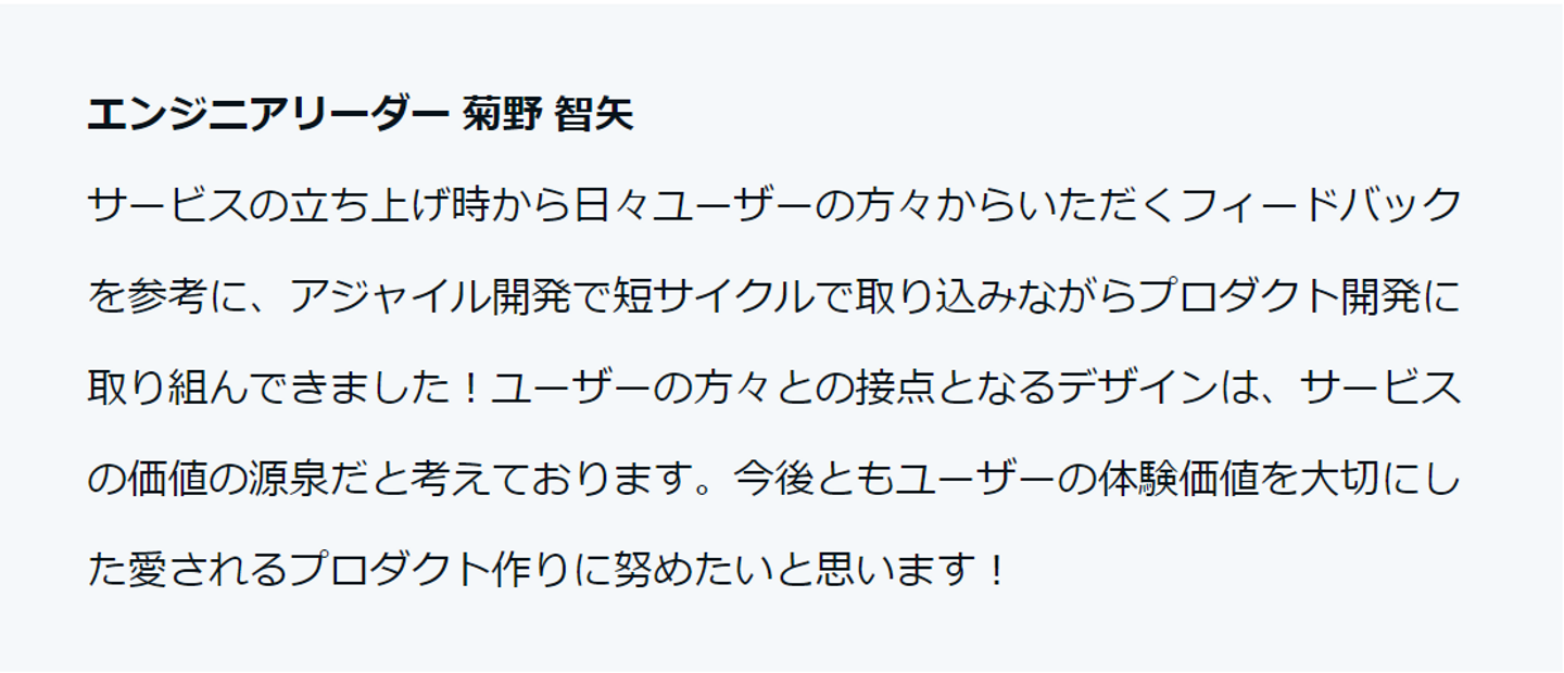 ここからは、実際に現場でサービス開発をしている代表メンバーからコメントをご紹介します。