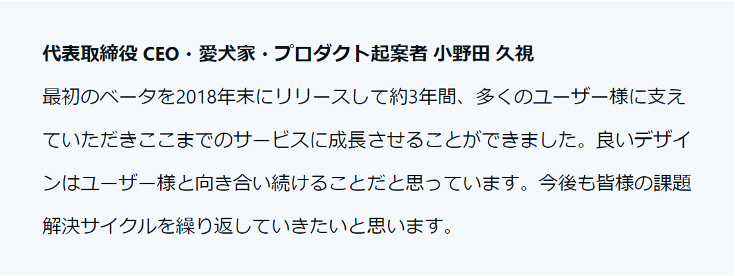 今後はonedogを通じて、犬という生き物の特性を深く理解し、正しくお世話する事ができるよう、健康文脈からサポートすることで、愛犬とオーナー様が少しでも長く元気に連れ添えるようにしていきたいと思っています。そして、onedogのサービス拡大・浸透を通じて、それらを実現し、犬の社会的地位の向上を訴えかけることで、今よりももっと犬と人間が共生しやすい社会を作っていきたいと私たちは考えています。