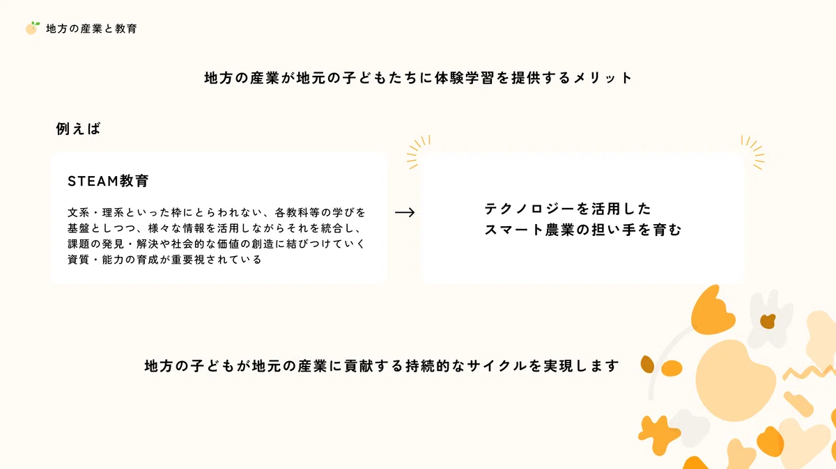 ワークショップで提供するコンテンツについて、地方産業と連携することで、地方のこどもが地元の産業に貢献する持続的なサイクルを実現します。
