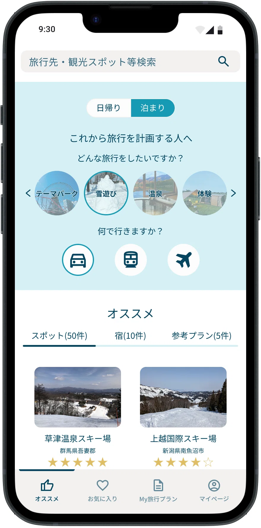 居住地や家族構成、好きな旅行にあわせて、おすすめの宿泊場所、スポット、モデルプランを表示します。