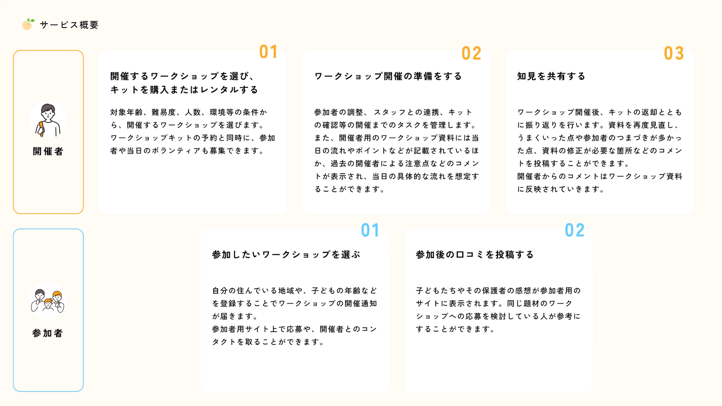 教員経験者や教育に興味を持っている人に、ワークショップの開催に必要なツールやプログラムを提供し、専門知識がなくてもワークショップを開催できるようにサポートします。