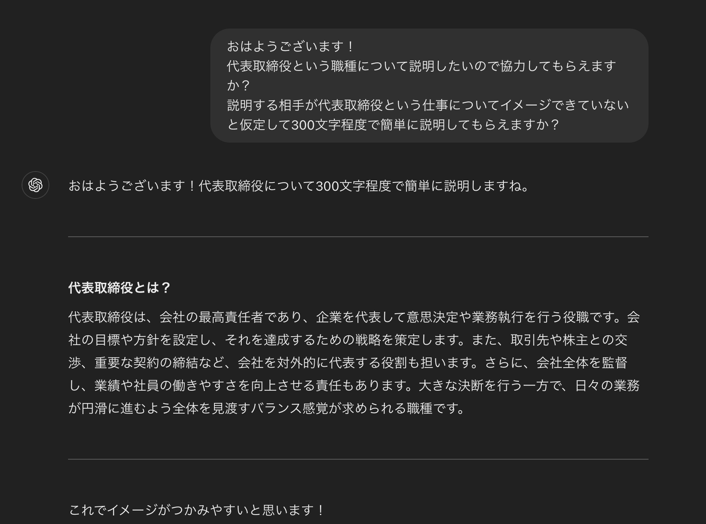 ではまずはChatGPTさんに代表取締役とは何か聞いてみましょう!