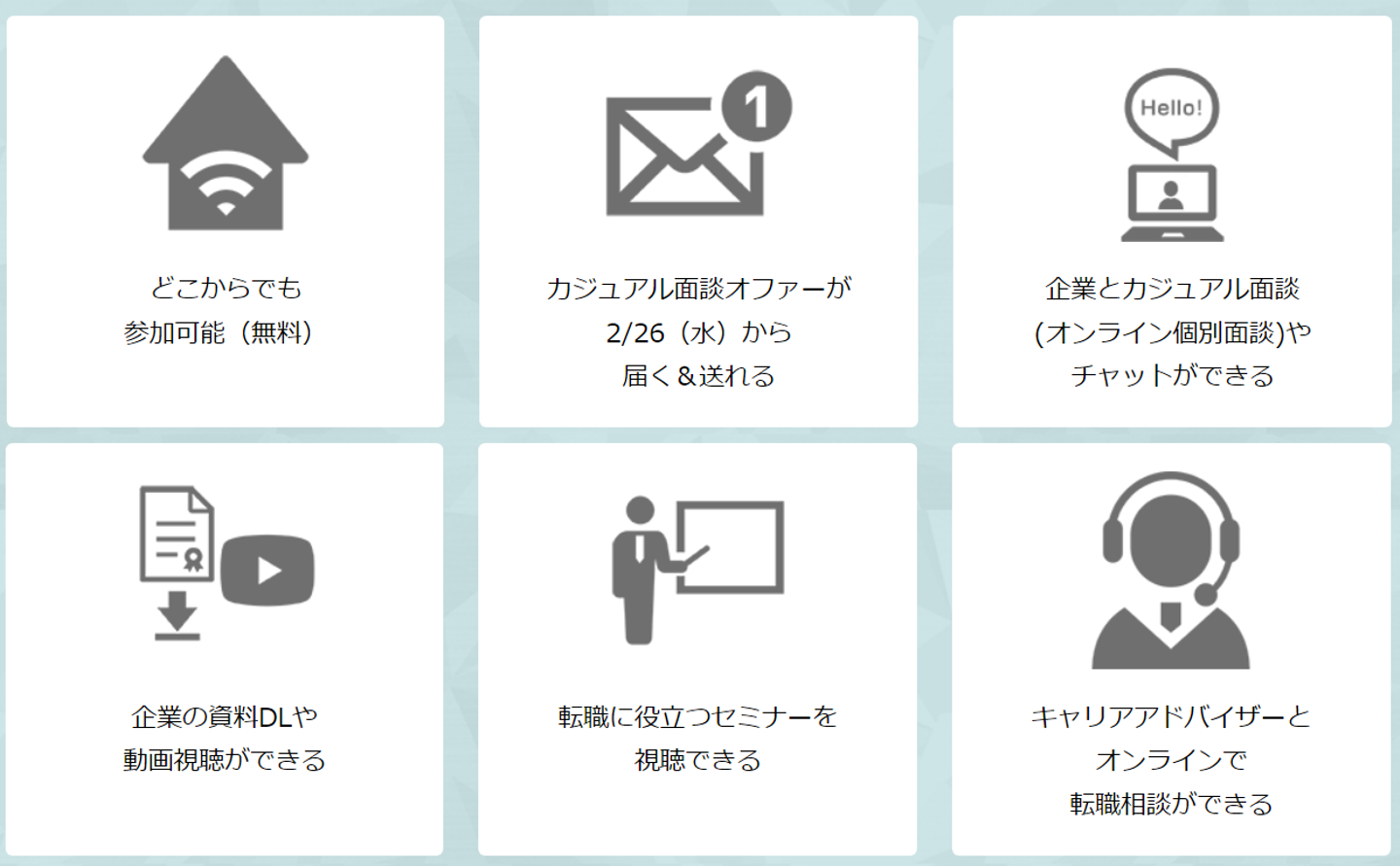 他にも、転職役立つセミナーを視聴できたり、キャリアアドバイザーとオンラインで転職相談ができるなど、1度の参加でさまざまな転職ノウハウ効率的に得ることができます。