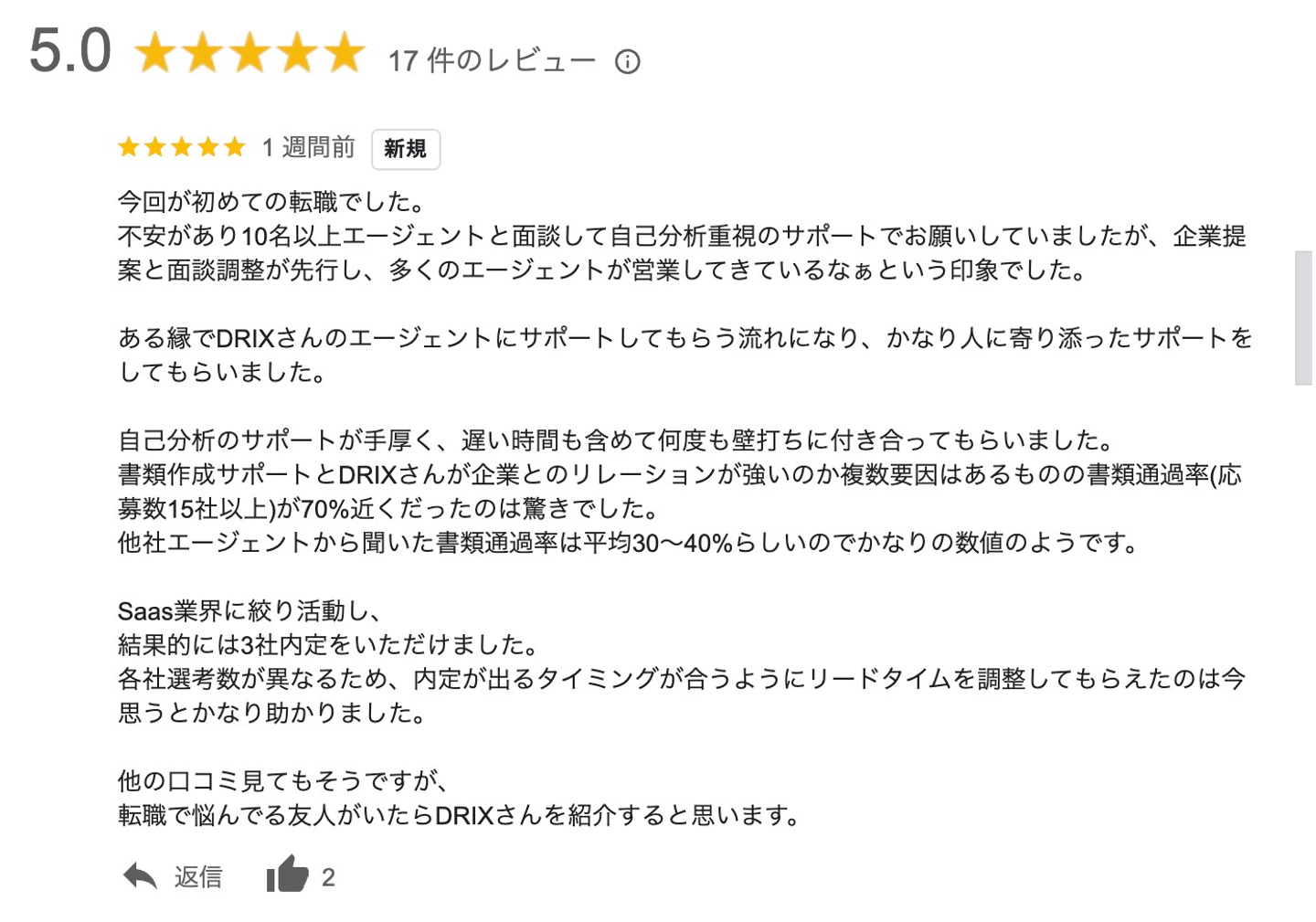 ただ、DRIXには決まりきったフレームワークはありません。私としてはDRIXの理念に沿った形で自分の型で向き合えるのでやりがいもあります。お客様のニーズに合わせて最適な提案し、サポートができる自由度の高さや、信頼を得られる環境で働けていることに入社してよかったと感じることもあるほどです。あとは自分がサポートさせていただくお客様に対して何ができるか、どうすればより良い提案ができるかを都度自分で考えアレンジできるぶん、お客様の転職が成功した際いただく「ありがとう」のお言葉はとても嬉しいです。もちろん転職後に活躍している姿を目の当たりにできるのも、ご支援以降も食事やお茶などプライベートでの繋がりにまで発展するのも、この仕事ならではの面白さだと思います。