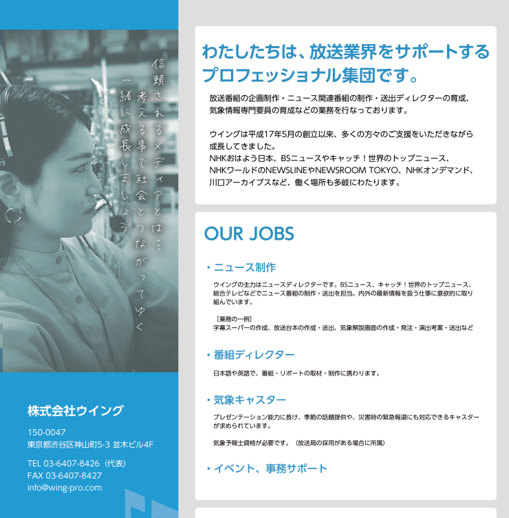 ウイングは、NHKのOBが2005年に設立したディレクターズ・エージェントです。NHKおよびNHKグループ会社の放送現場にスタッフを派遣し、ニュースの制作や送出、報道番組の企画制作や演出などを担当させていただいています。最近はインターネットによるコンテンツ配信業務も増えてきました、また、ウイングには気象キャスターも所属しており、気象情報コーナーを担当するディレクターたちと共に専門性を発揮している点が、他のエージェントと異なる特徴かと思います。