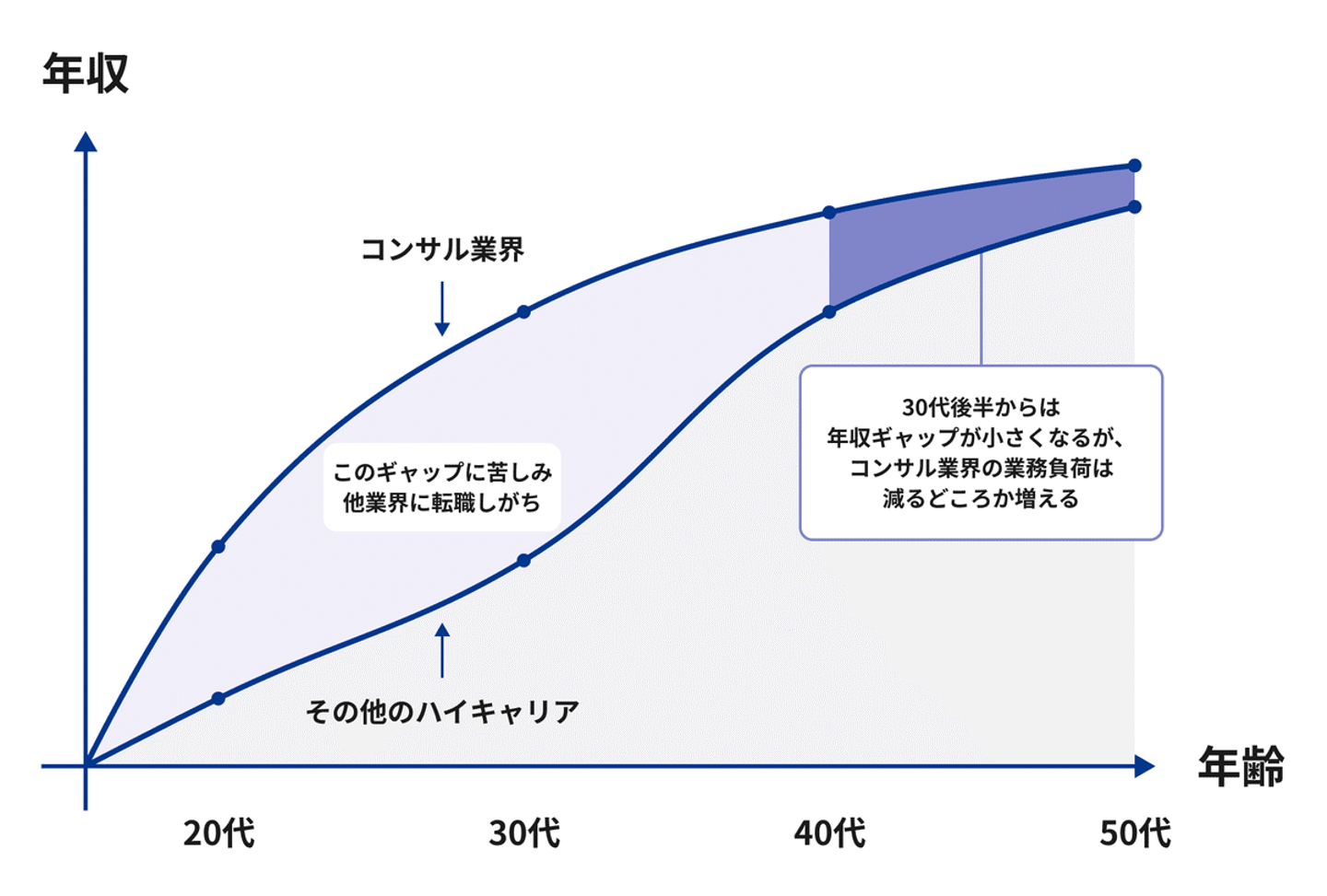 一方で、若いうちから責任ある仕事を任され、それに伴って給与もスキルも比較的早く上がっていく傾向にあります。これ自体は素晴らしいことなのですが、同時にキャリア的な難しさも生じさせます。特に、キャリアの初期からコンサルティング業界に身を置く場合、他業界と比較しても年齢の割に給与水準が高くなりがちです。そして給与水準に比例して生活水準も上がってしまうのです。