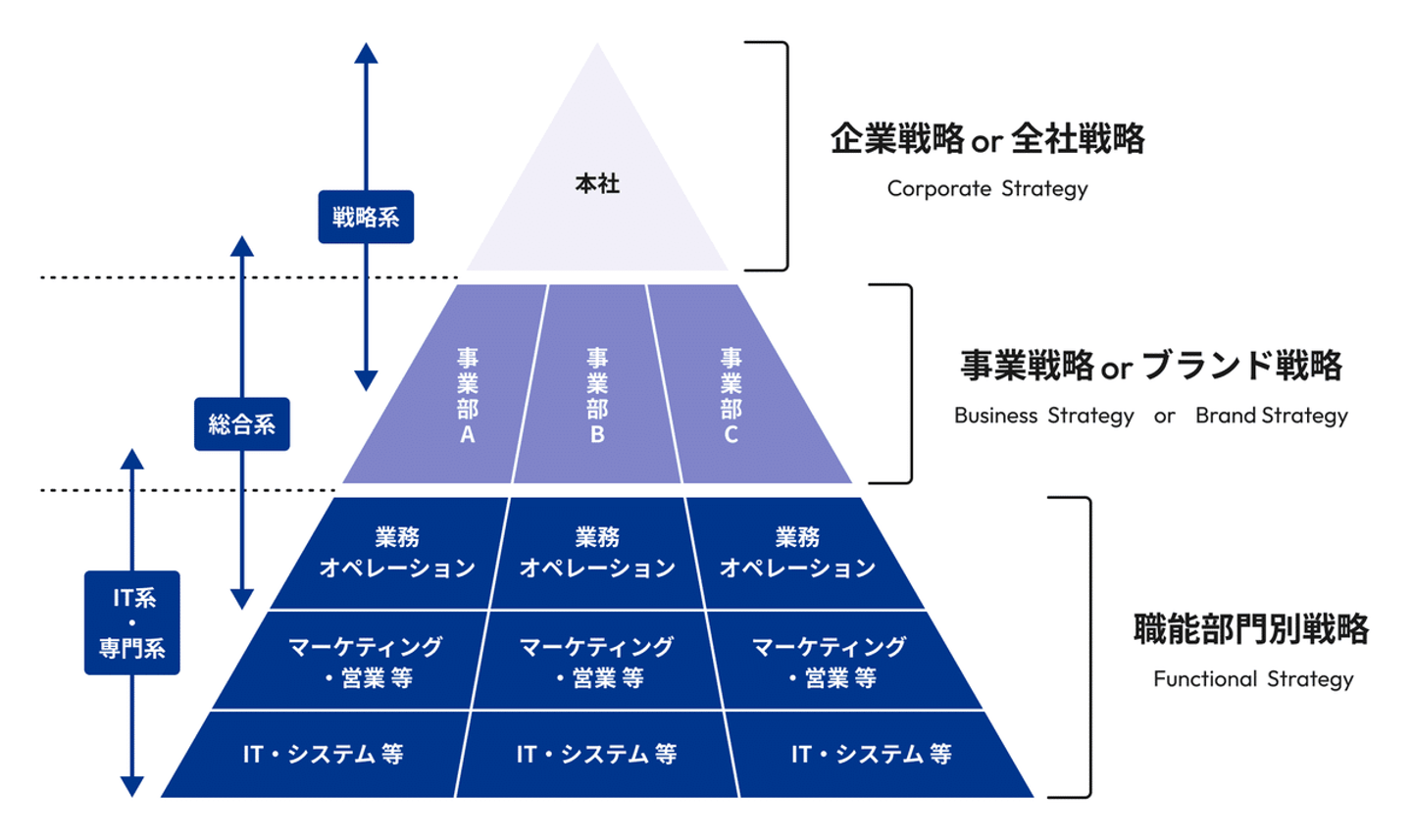 結局、コンサルティング業界にもレイヤーが存在し、経営戦略や事業戦略を立案・検討する企業があり、その後どう実現するかの運用や実行段階のオペレーションを設計する企業があり、実際のオペレーション実現のための各機能(マーケティング、人材、システム 等)を設計する企業などがあります。