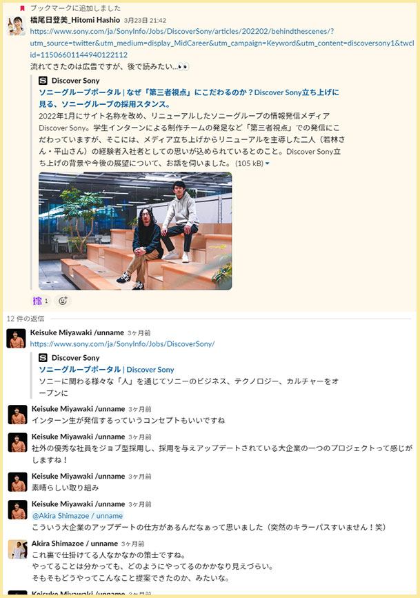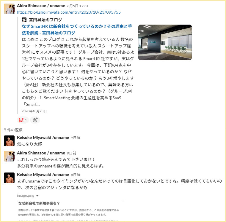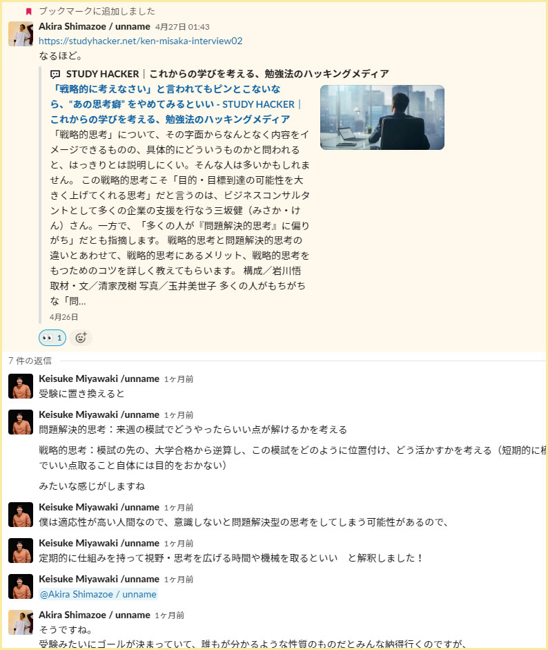 良い記事や情報を見つけると、所感を添えてシェア。そこに他のメンバーが自分の意見を展開し、やり取りが発生します。誰でも見られる場所に残っていることで、相互理解促進やキャッチアップ、思考の深堀りトレーニングまで有効です。