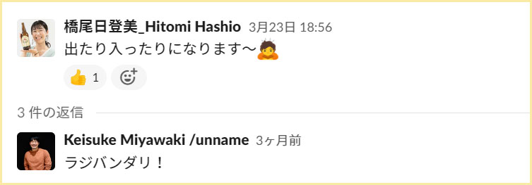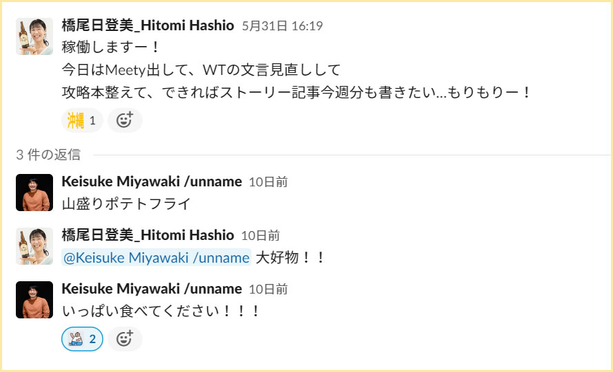 けど決して同調を求めたり、圧力になっていないのは、ポップで気軽な会話とのバランスが取れているから。真剣にビジネスに向き合う姿勢と、楽しむ心の両立が見て取れる日々の会話でした。