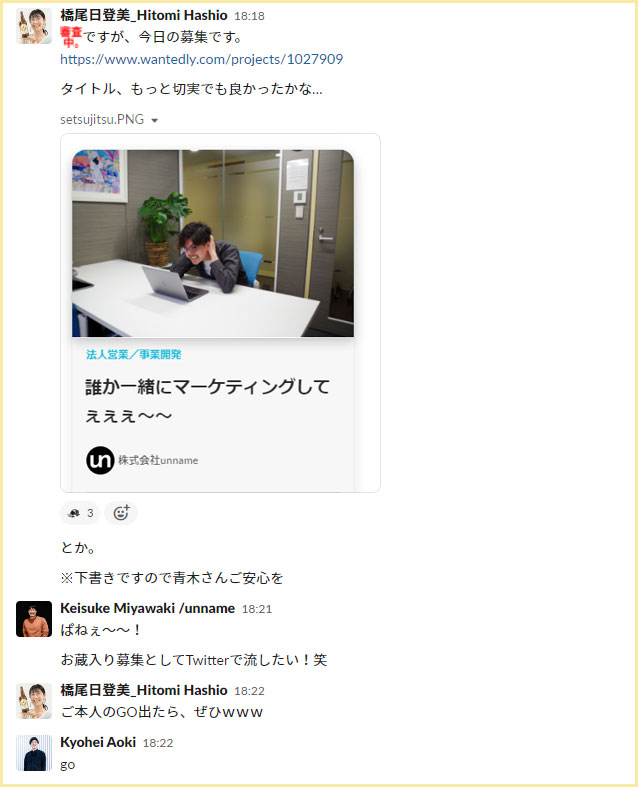 そこで、社内のことを知ってもらおうと、日々のメンバー同士の会話を勝手に公開!コミュニケーションツールSlackの一部をツッコミと共にお届けします☺