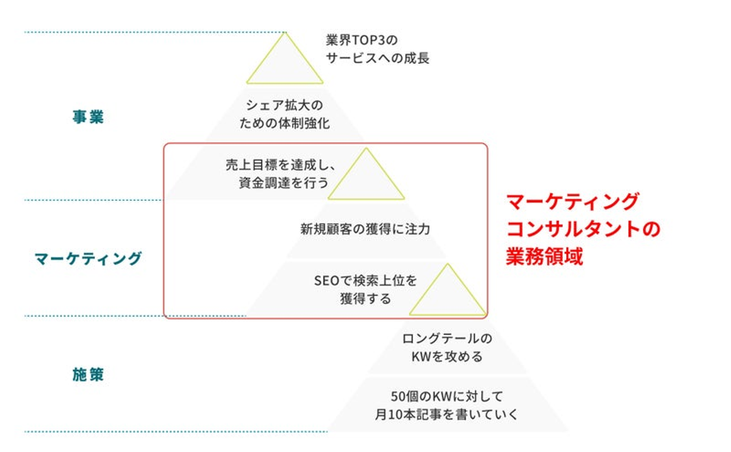 ここで言う『マーケティングコンサルタント』とは…BtoB企業を中心に、マーケティング支援のコンサルタントをお任せします。企業課題の整理から、戦略立案、施策の実行までを伴走するポジションです。特定のマーケティング手法に限定せず、マーケティングの側面から事業成長支援を手がけます。