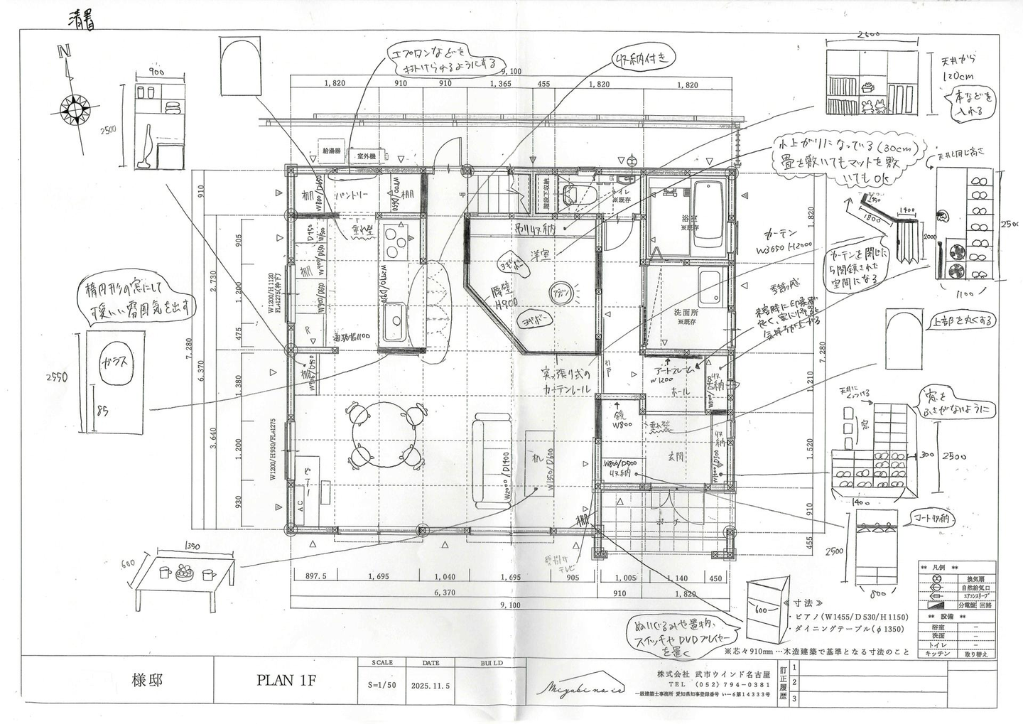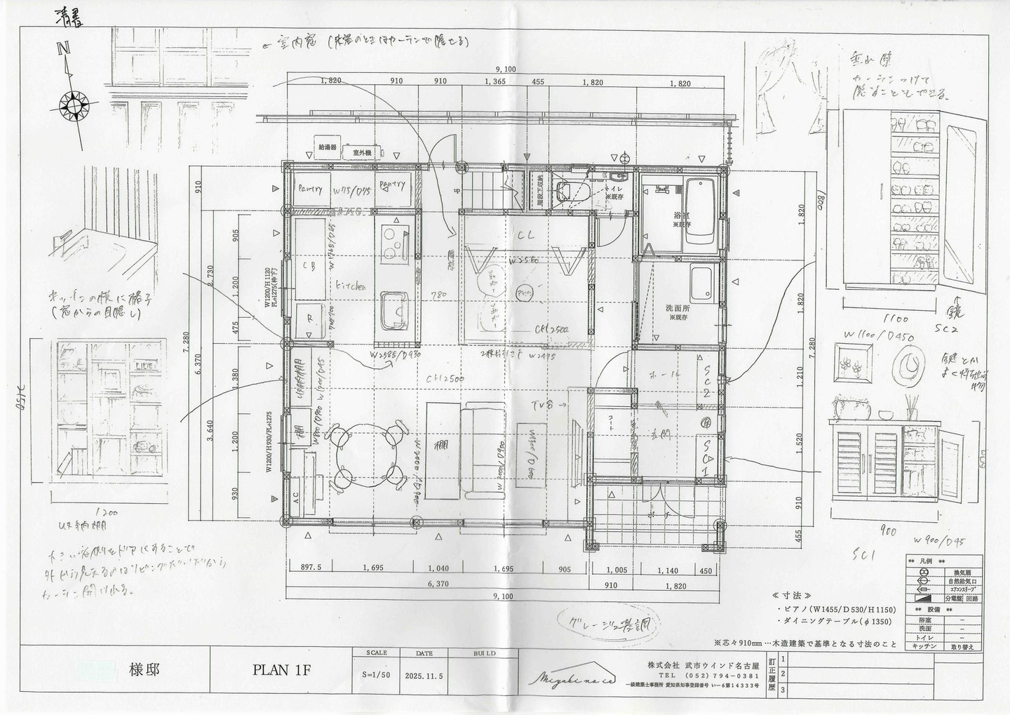 それぞれのサイズや意匠だけでなく、なぜ?というところまで書込んでいる。また、棚なども描いてイメージがしやすいですね。