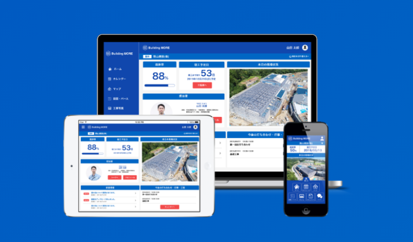 このような背景から隂山建設さまとプレイノベーションが連携しプロダクト開発に向け歩みはじめました。その結果、建設情報を可視化するアプリ「Building MORE(ビルモア)」を自社開発。まずは隂山建設さまの自社システムとして利用し、精度を高めているところですが、社内外からの評価が高く、現在社外向けに提供できるように準備を進めている最中です。