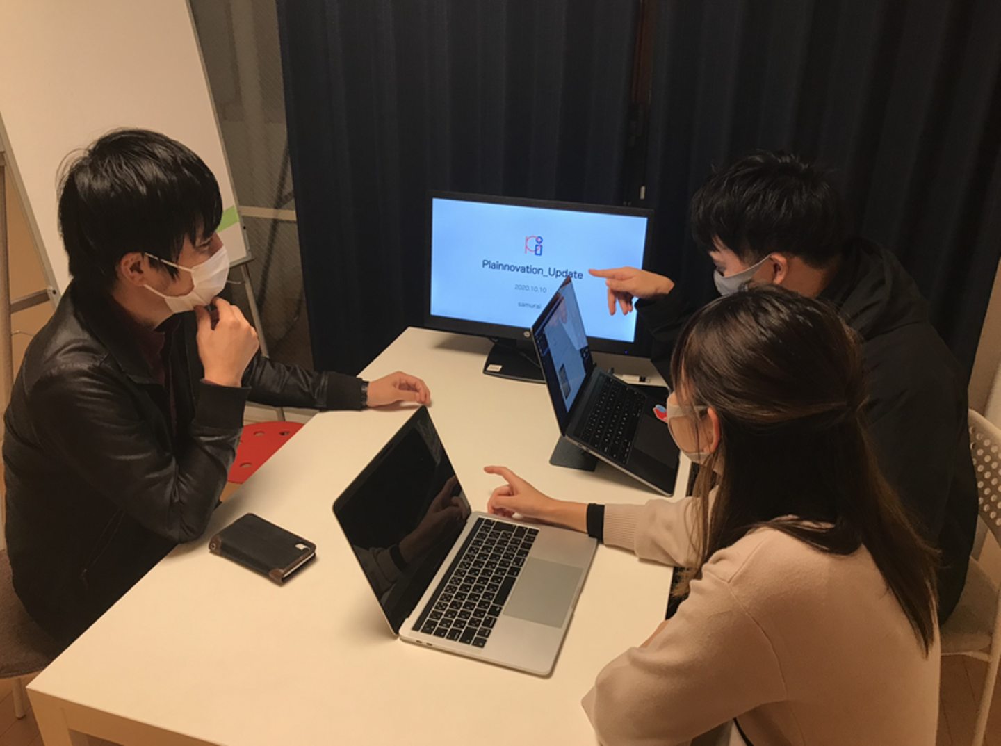 また、プロジェクトごとにいろいろな人と関われるのがプレイノベーションで働くおもしろさだと思います。クライアントはもちろんのこと弊社では副業でも様々な人が関わっております。現在は株式会社メルカリで働く西丸さん、Awai, Inc.の堀江さんに携わっていただいております。社内とは、また違った目線でアドバイスをいただくことができ、個人的には、社外上司ができたみたいですごく学びがあり、楽しいです。