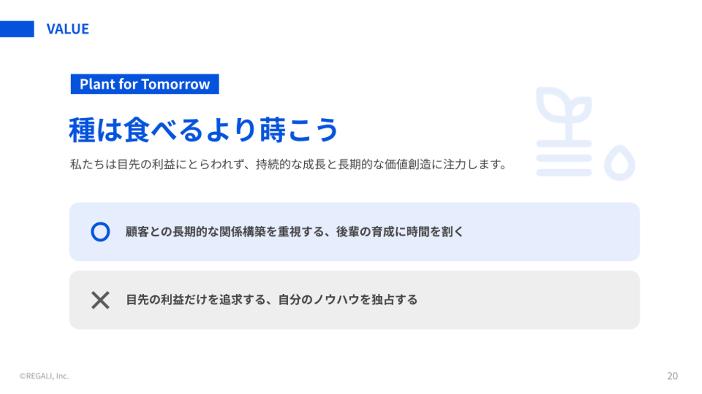 REGALIでは、日々の行動や意思決定の軸として6つのバリューを掲げています。Company Deckではそれぞれ「こういう行動はOK」「こういう行動はNG」の具体例も添えているので、カルチャーフィットを考える際の参考にしていただけると思います。