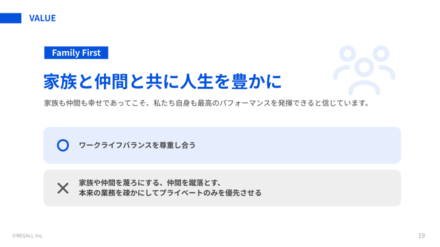 REGALIの根幹にある価値観です。家族も仲間も幸せであってこそ、自分自身も最高のパフォーマンスを発揮できる。だからこそ、ワークライフバランスをお互いに尊重し合う文化を大切にしています。