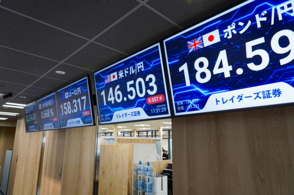 トレイダーズ証券の執務エリアには、世界各国の時刻が一目でわかる「世界時計」が設置されています。
