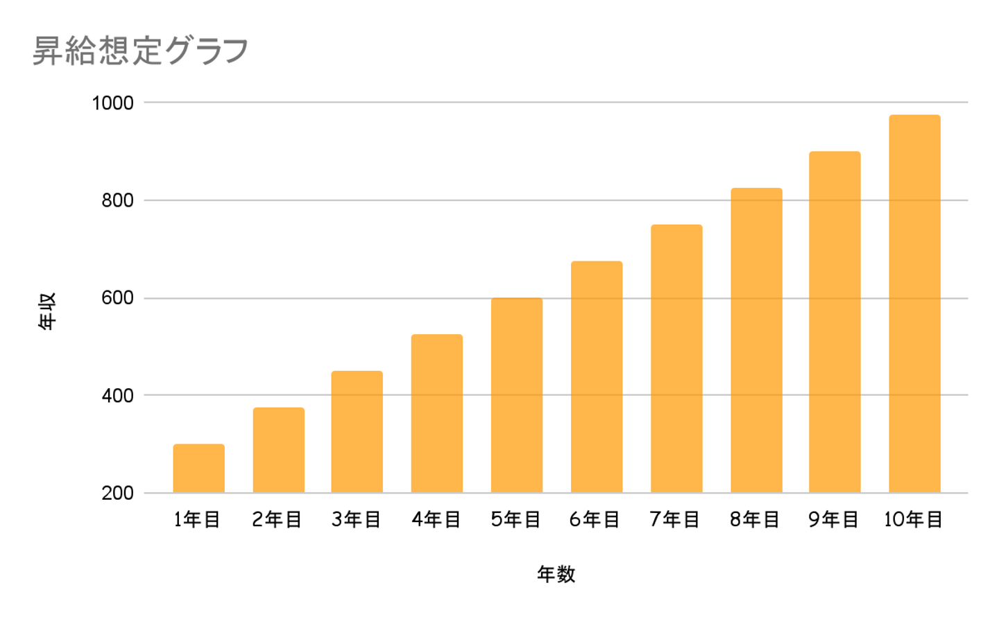 過去の事例を基に、未経験で入社された際の昇給想定をご紹介します。 (※昇給額は半年で計算しています。※当実績はエンジニアのみで計算しています。)