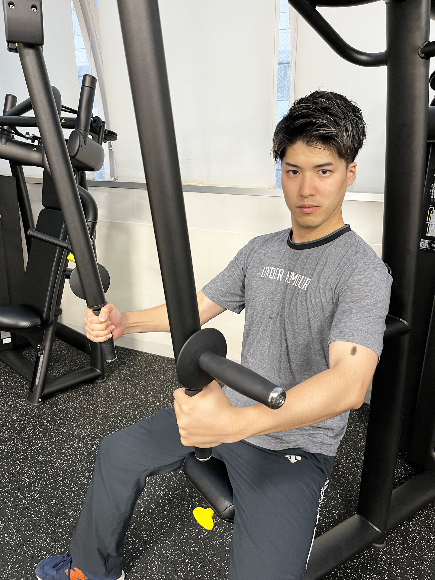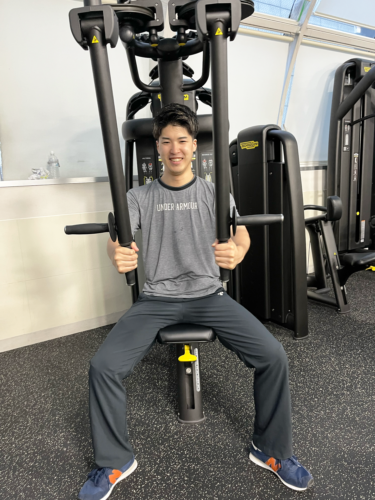 これはペクトラルフライという器具で主に胸と腕のトレーニングに使います。