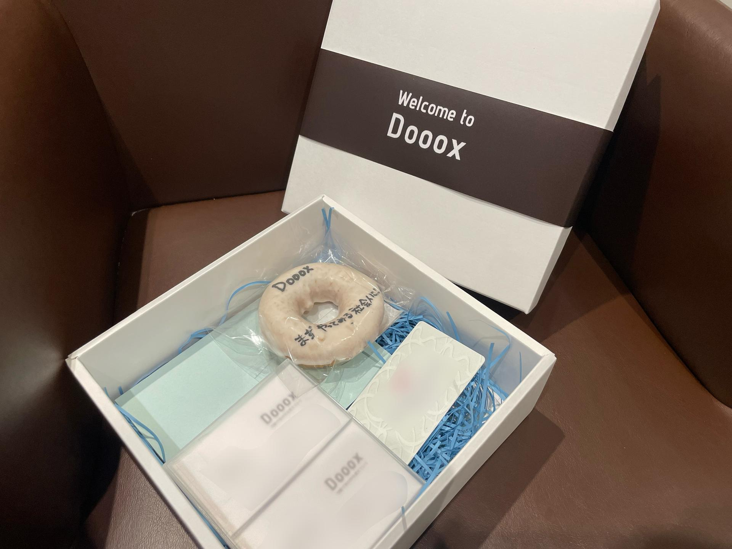 名刺などに加え、メッセージを添えた会社のロゴ入りドーナツ「Doナツ」などを箱に詰め込みました。
