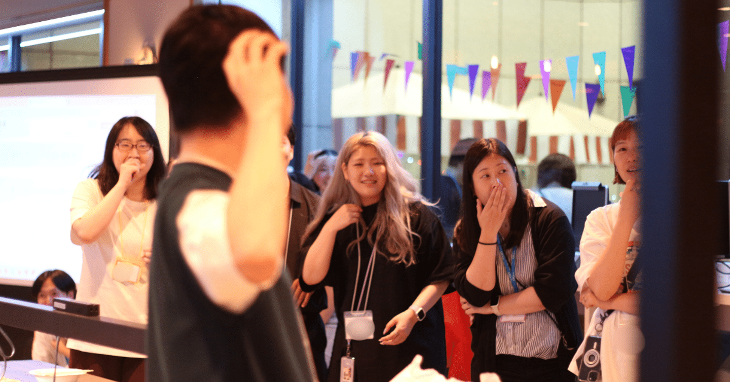 スライドに映し出されたお題をジェスチャーだけで伝え、リレー形式でどれだけ多く正解できるかを競うシンプルなゲームですが、これが大盛り上がり!