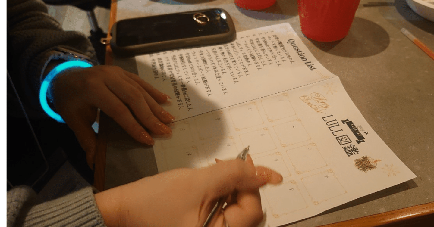 配られた4×4のマスが描かれたシートを手に、他の参加者に声をかけて質問を投げかけます。「出身が関東以外の人」「ペットを飼っている人」など、質問リストに該当する人を探し、そのマスに名前と数字を記入してもらいます。渡された謎の紙はこちらで使うんですね~😌