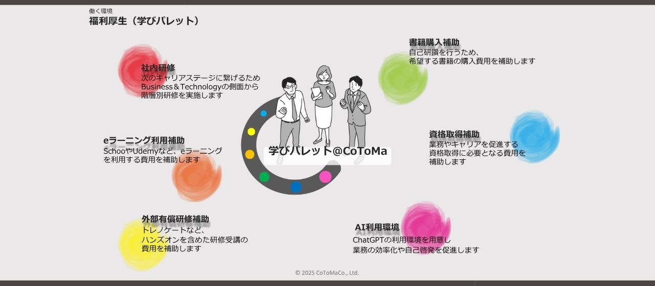 CoToMaにとって、働く環境や福利厚生はすべて「エンジニアの価値を高めるための手段」でしかありません。価値向上に繋がるのであれば、何でも積極的に取り入れていくスタンスです。