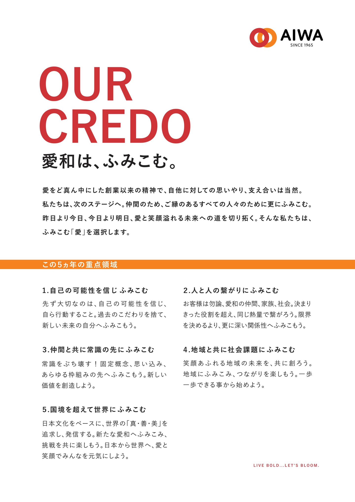 愛和として変わらぬ想いを言葉にしながらも、特に当面の5年の重点領域も言語化することで長く、その時々の重点目標を反映しながら進める「生きたクレド」になっている点も特徴です。