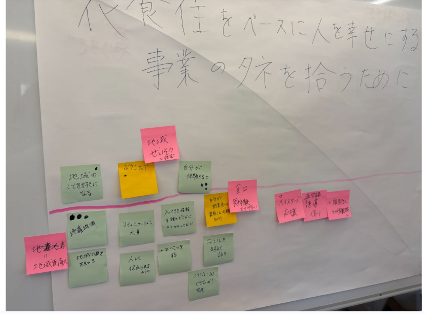 ▲このチームの「衣食住をベースに人を幸せにする事業のタネを拾うために」というテーマでは、『地産地消』『自分が体験する』などの意見が票を集めました!