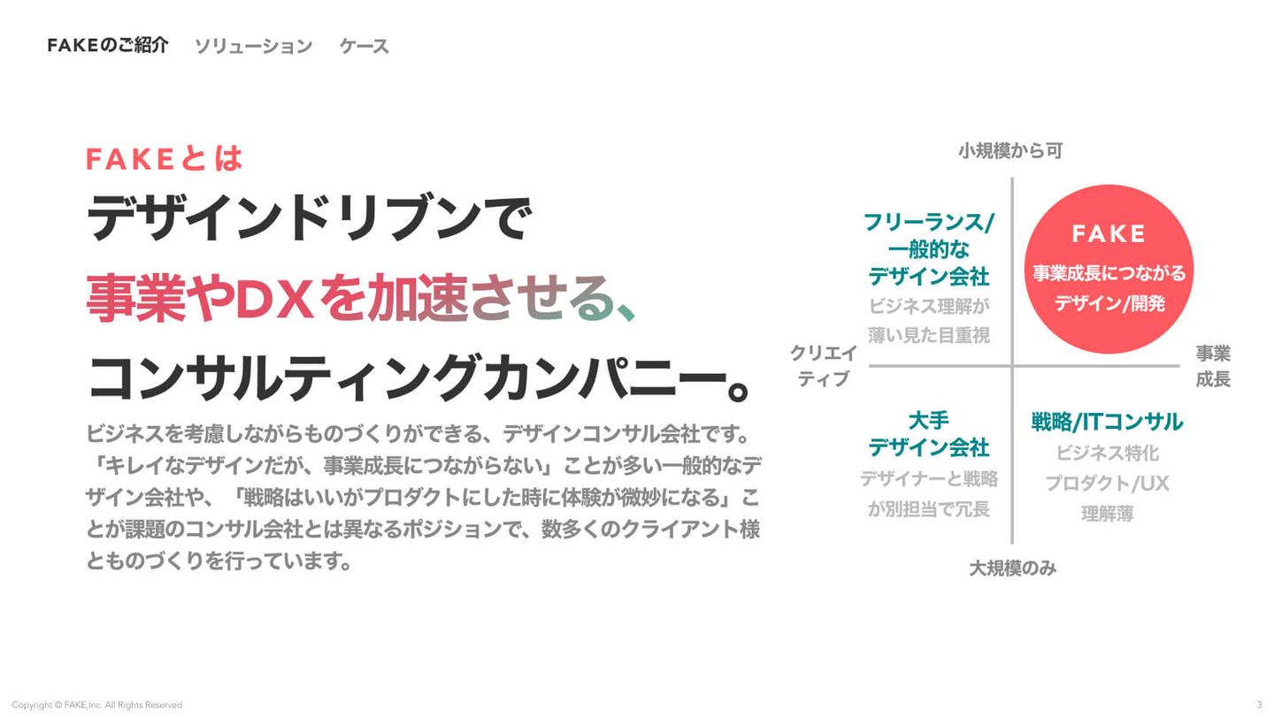 UX起点で総合的なビジネス視点を駆使することで、一般的なデザイン会社、コンサル会社が苦手とする領域をカバーするFAKE inc.。