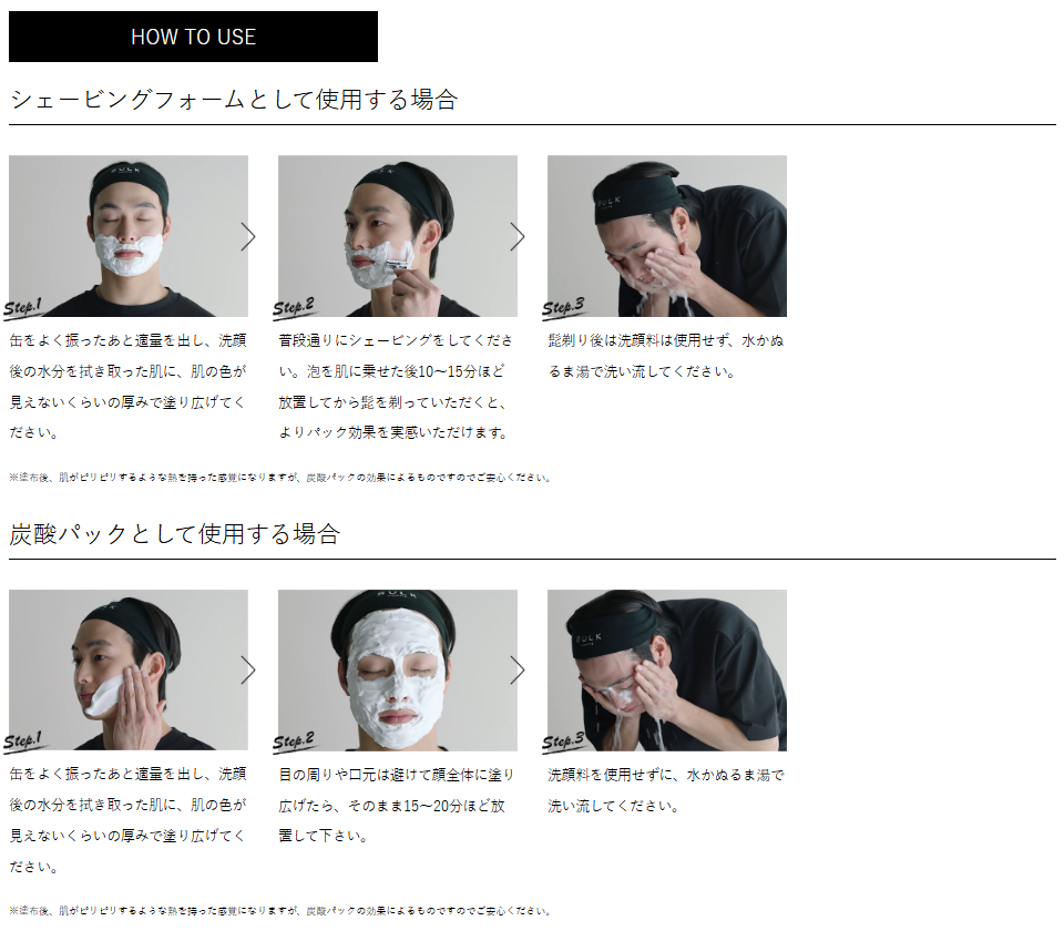 THE SHAVING FOAMは、これまで肌に負担をかけていたシェービングの時間を、肌にポジティブな効果を与えるスキンケアタイムに変える、これまでにないアイテムです。 シェービング剤としてだけでなく、「炭酸パック」としても使用できるため、髭剃りをしないときは肌の土台を整えるためのスペシャルケアアイテムとしても活躍します。