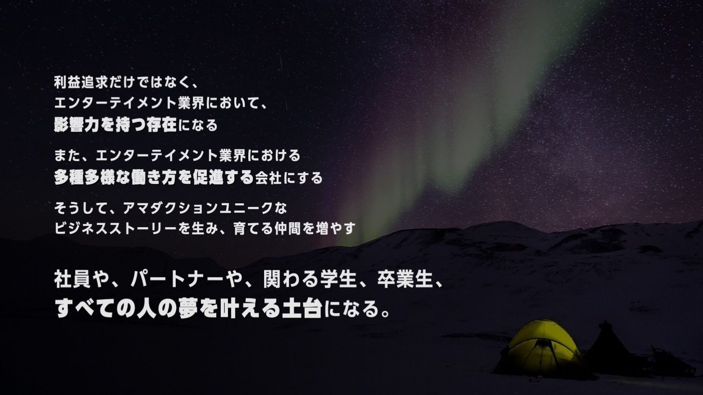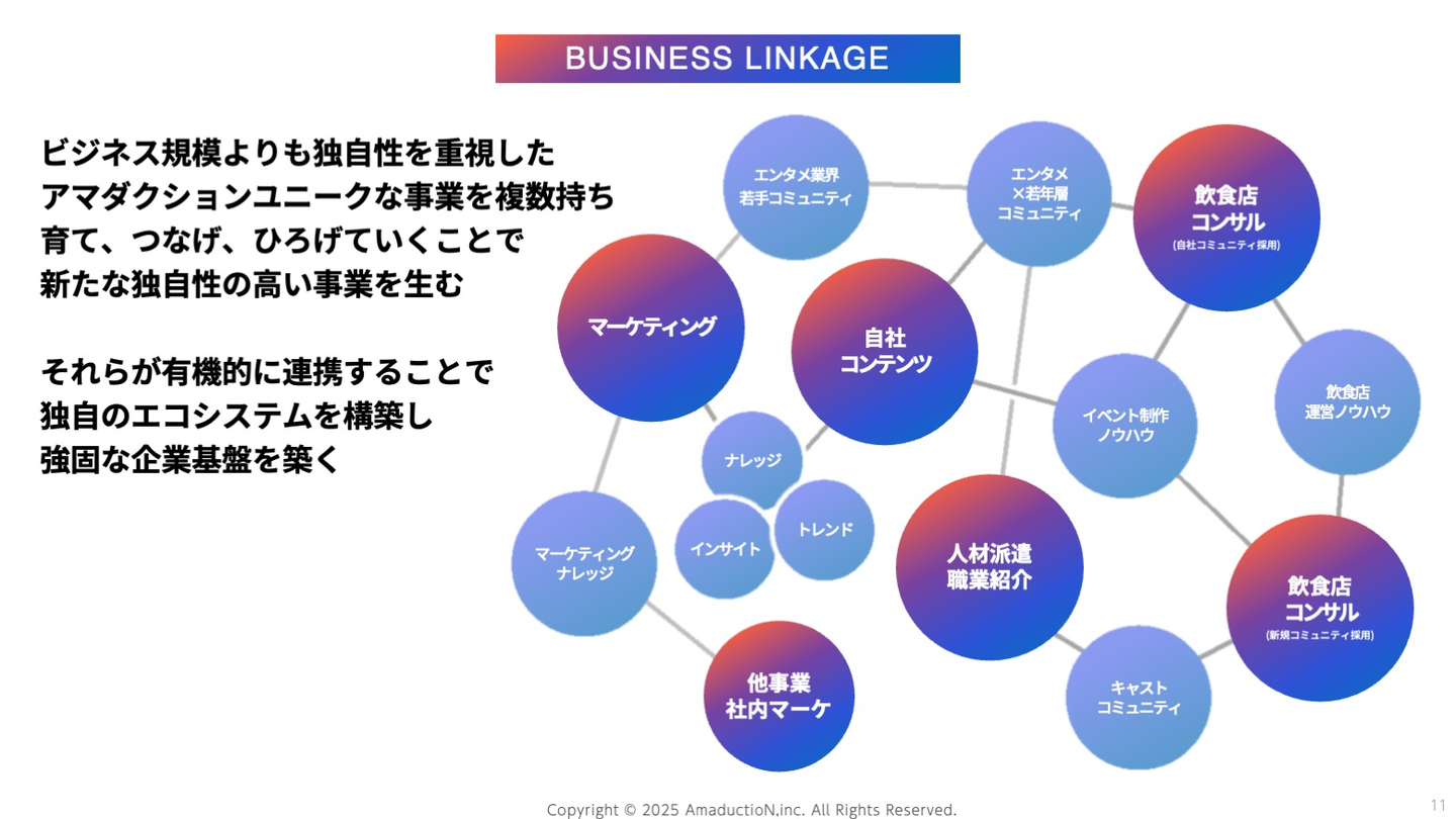 コンテンツの周辺には年間述べ1,000人以上の大学生パフォーマーをはじめとした当社独自の若年層コミュニティを形成し、そこから得られるナレッジやリレーションを広告事業に活用したり、飲食店やIPなどの新規事業の開発に活かしたりと、AmaductioN独自のエコシステムを構築しています。