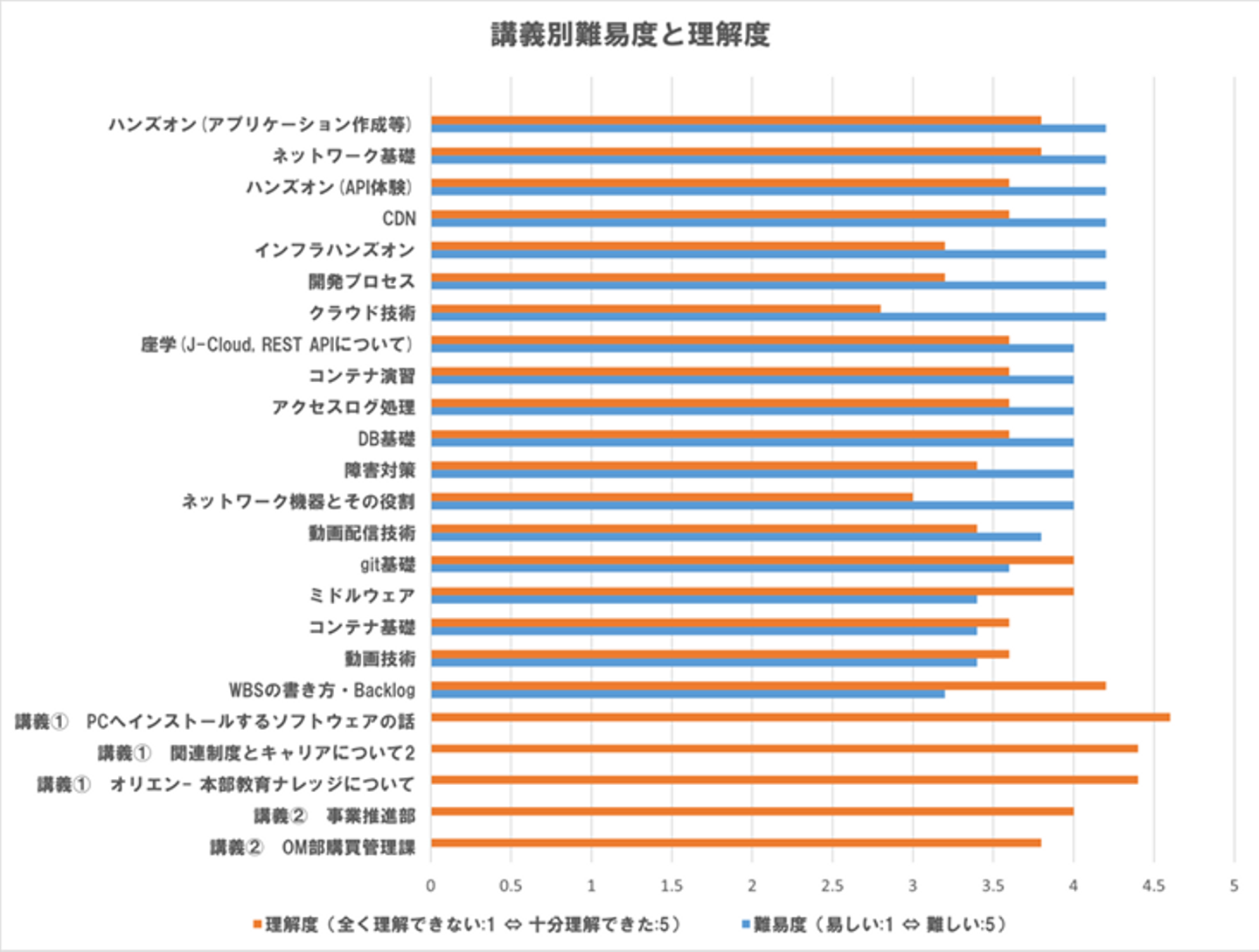 講義別の難易度と理解度は、以下のような結果でした(図2)。配属後の技術研修では、自身の専門領域や所属部署以外の技術知識も学んでもらいますが、難易度は、全体的に高めに設定しています。特に、ハンズオンは難易度高めの反応でした。