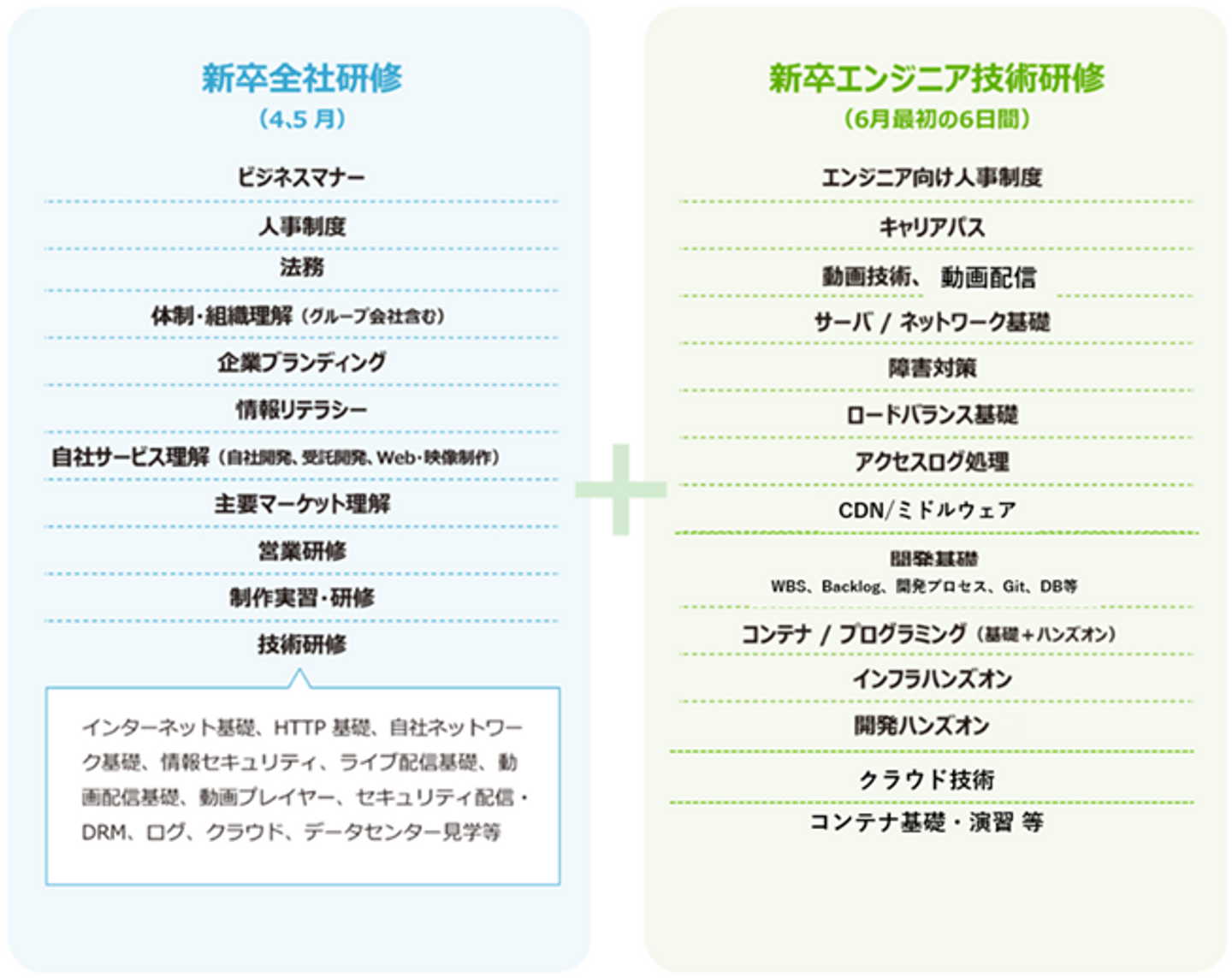 【図1】新人研修の全体像。左が人事部研修、右がITエンジニア向けの新人技術研修