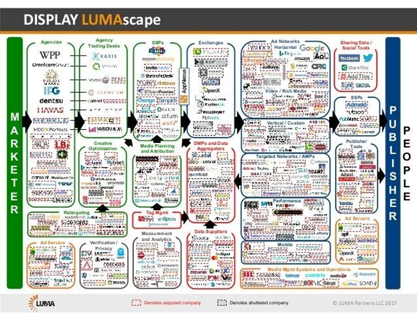 画像を見て頂ければわかると思いますが、上で述べたオリジナルのLUMAscapeは、ディスプレイ広告業界を対象にしたもので、そこでは、広告主からメディアに至るまでのルート(各サービスの関係性)が示されています。「どの企業を統合すると、効果的でインパクトが大きいのか」だけでなく、「統合すると業界地図はどのように塗り替えられるのか」まで容易に考えることができるもの。それがカオスマップの起源のようです。
