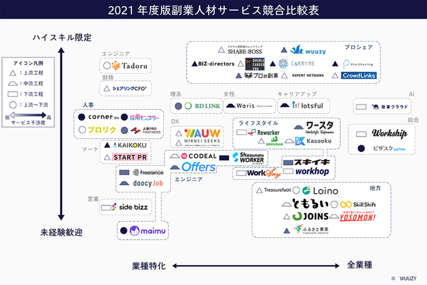 サービスの干渉度合いというのは少しわかりにくいかもしれませんが、ざっくりと、プラットフォームタイプか、エージェントタイプかというイメージです。サービスのサポートが手厚ければ手厚いほど、色は濃くなっていきます。一方で色が薄い=サービスが良くない、ということではありません。色が薄ければ薄いほど、サービス料は抑えられて、価格も低くなる傾向があったり、より自由なマッチングが可能になっているケースが多くみられます。加えてカテゴリー枠は、MECEに業種区分することが難しかったため、あくまで各サービスを特徴づけるただの+α情報だと考えてくださいませ。