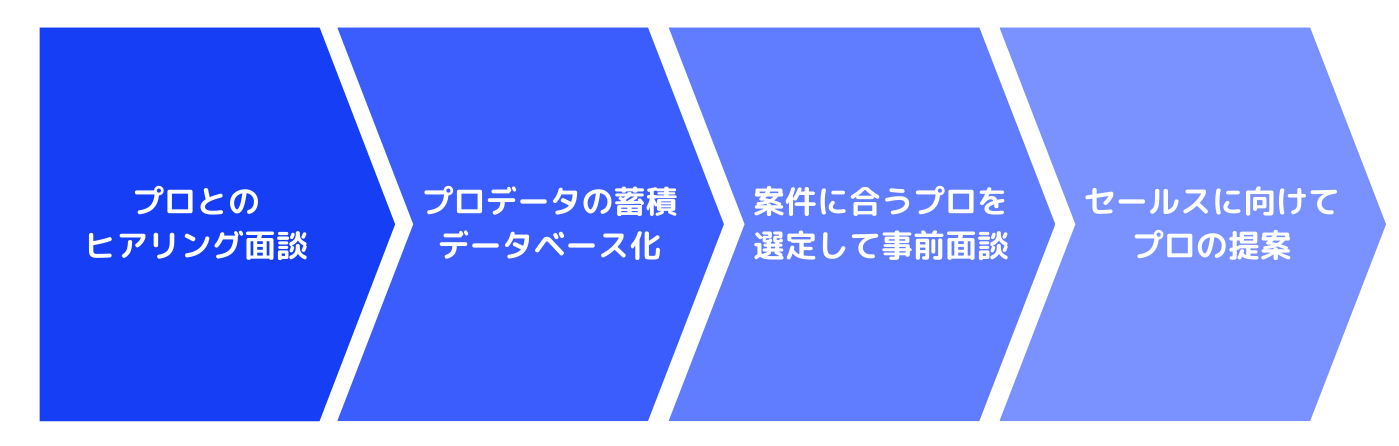 クライアントからくる案件をプロの方々にご紹介しつつ、その蓄積されたデータをもとに、エントリーいただいた方の中からより適しているプロの方をピックアップして、事前にプロと、案件についてのすり合わせと詳しいご提案をいただくために面談をします。