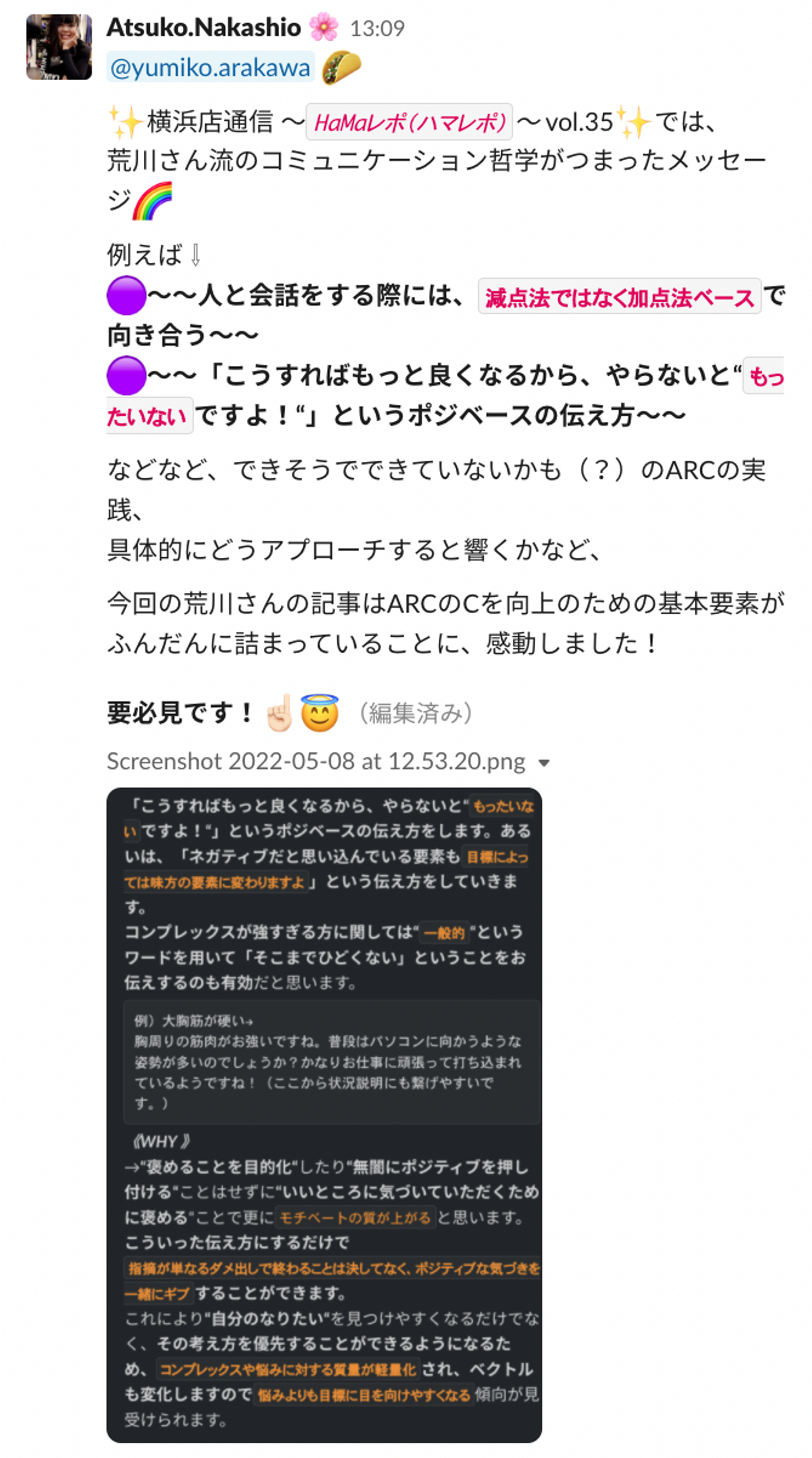 本来であれば、見逃されてしまう何気ないサポートや助言などが全体に共有されることで、店舗が離れているスタッフの日常が見えたり、ナレッジが共有されることで、組織全体へ好影響をもたらします。