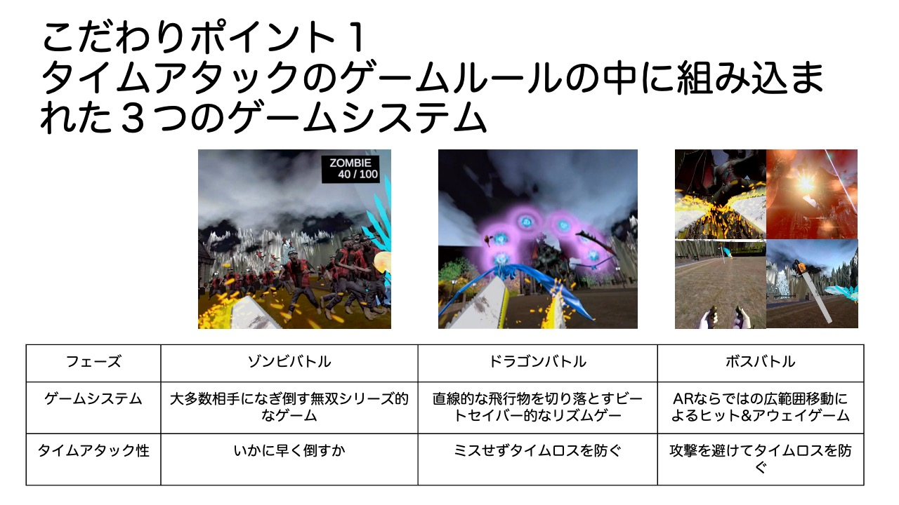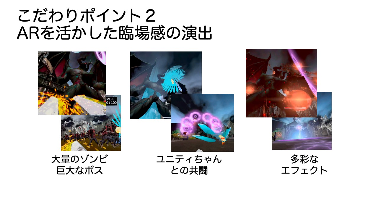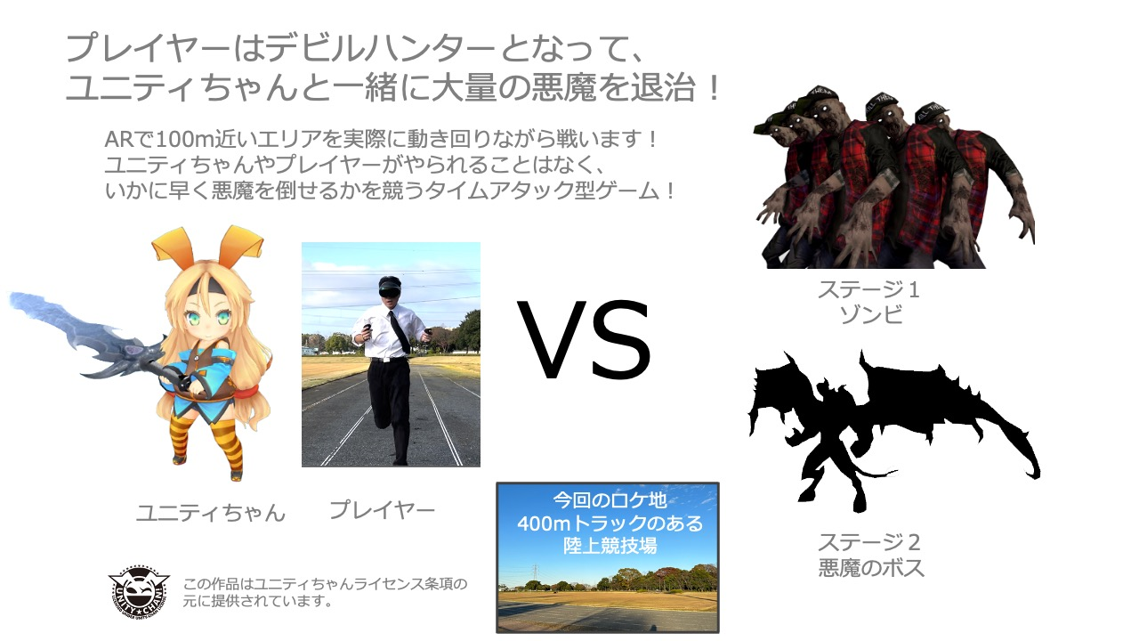 ゲーム内容の概要としては、下記の図のように、プレイヤーはデビルハンターとなって、ユニティちゃんと一緒に大量の悪魔を退治していくゲームです。以前の作品より広いフィールドを対象にしたいということで、100m近いエリアを実際に動き回りながら戦うゲームにしました。動画の撮影時は、400mトラックのある陸上競技場を一人で借りて、施設の人たちに不思議がられるという体験をしました。恥ずかしがっていたらARゲームは作れません。ゲームルールとしては、ステージ1のゾンビを倒すフェーズとステージ2のボスキャラクターを倒すフェーズに分かれています。ユニティちゃんやプレイヤーが攻撃されてやられるようなことはなく、いかに早く倒すかを競うタイムアタック型のゲームとして開発しました。