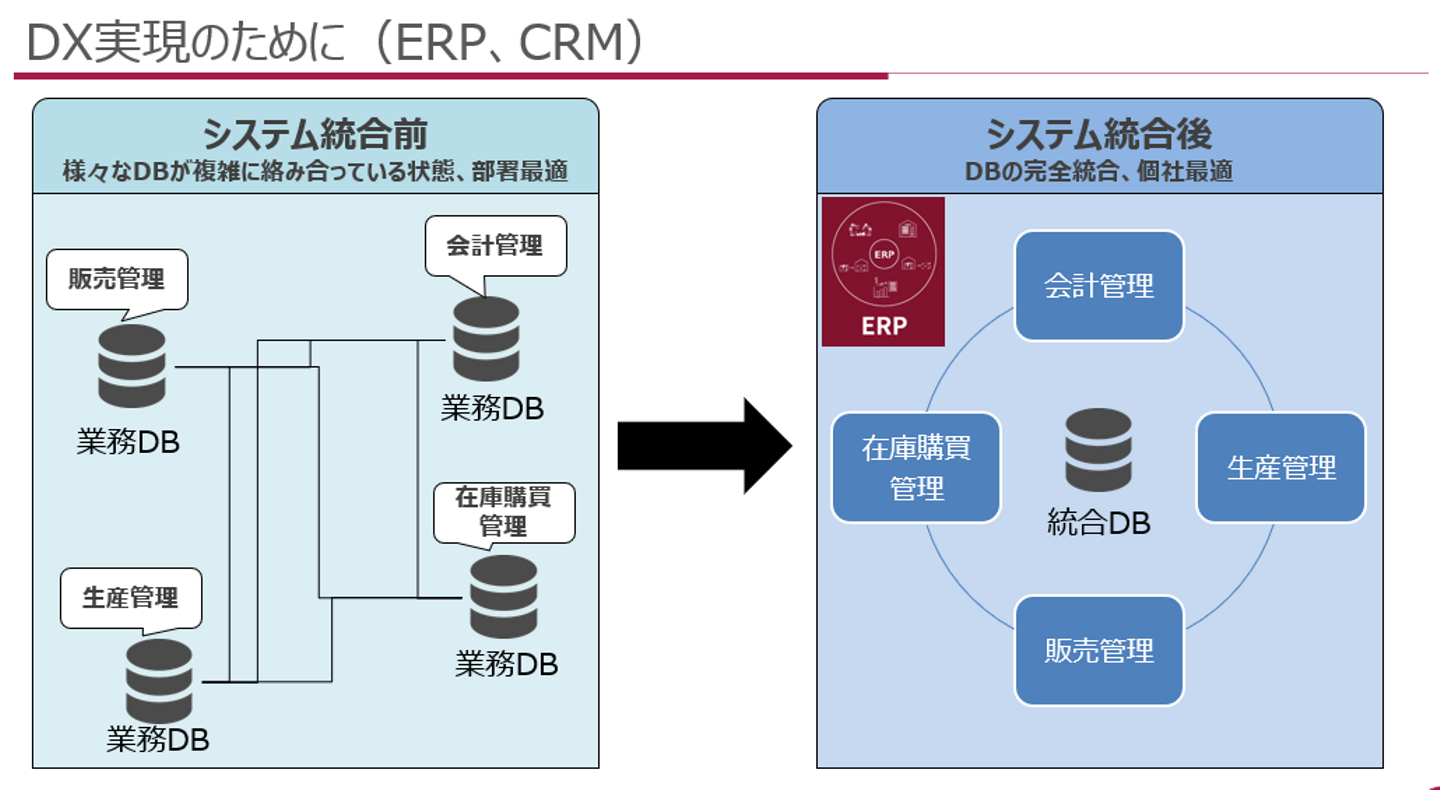 そこでERPシステムを導入することで、データベースが一つにまとまる。会社を経営する上での意思決定が、スピーディーになるというわけです。
