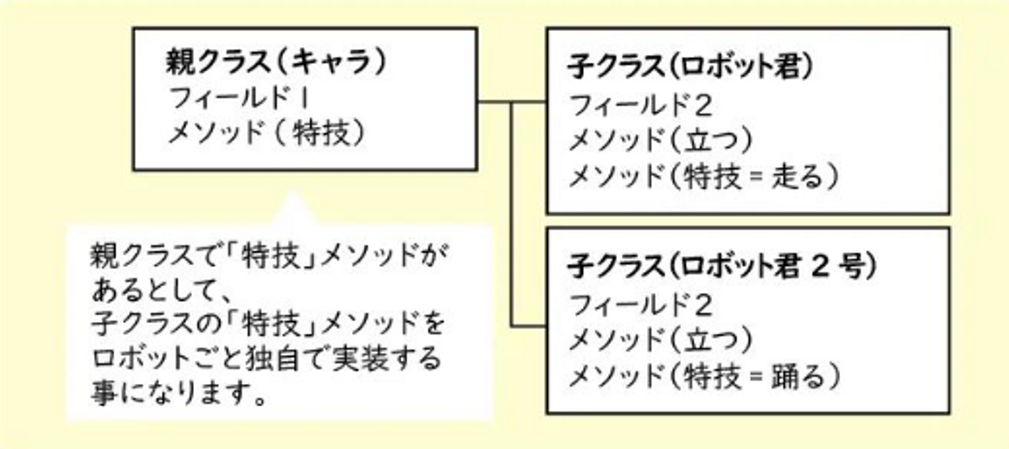 今回の例は、それぞれのロボット君に対して「特技」という同じメソッドでロボット君ごとに起こす「行動」が変わる仕組みを作る、といったイメージとなります。
