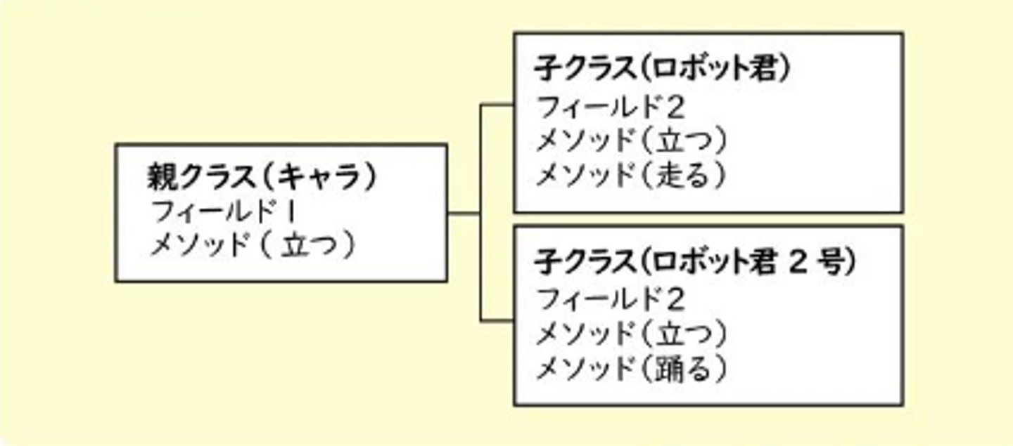 「『キャラ』は『ロボット君である』」という関係性をもたせるクラスが「継承」の特徴となります。