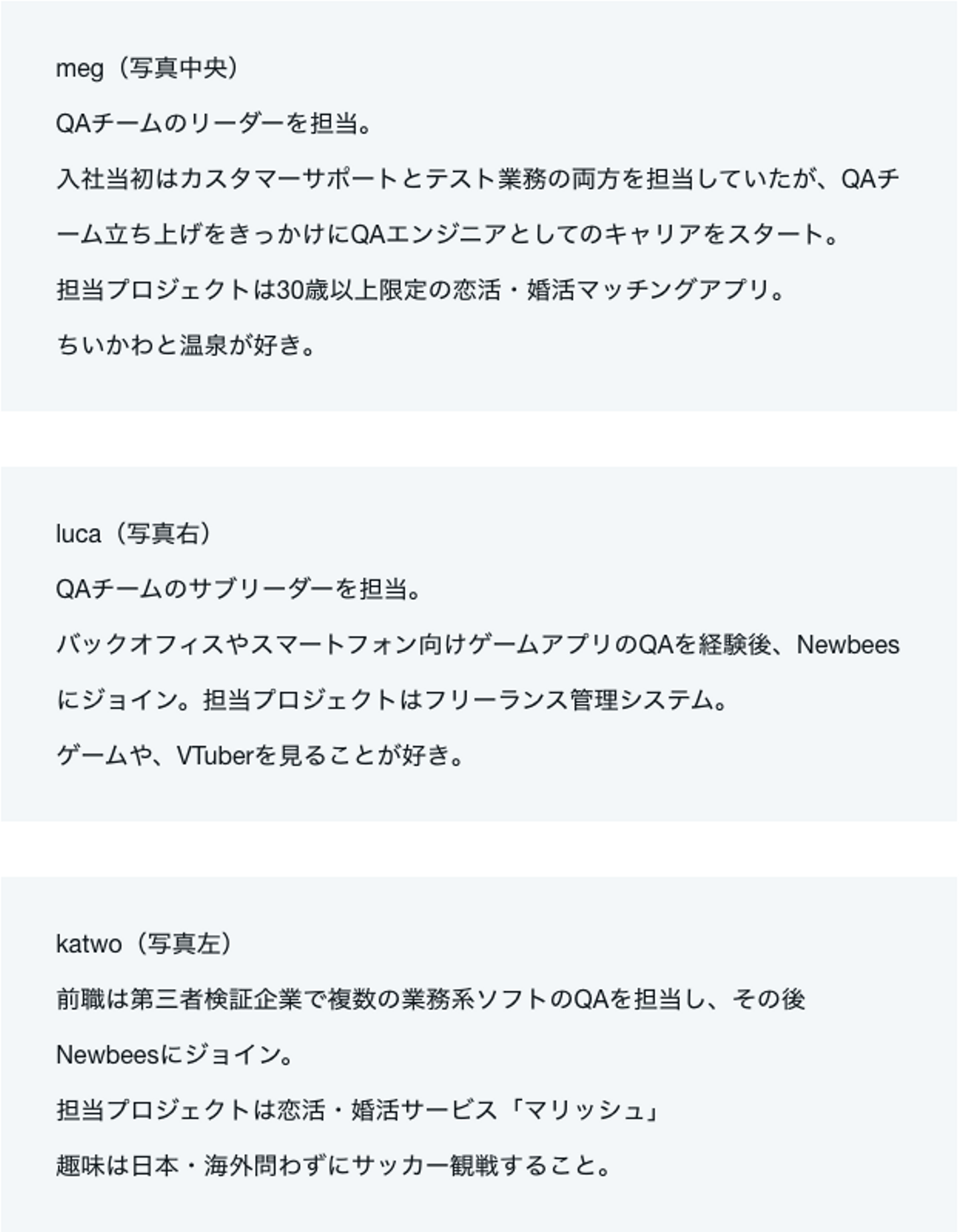 統一したことによって、作るときの迷いが減るだけじゃなく、レビューの観点でも見やすくなるようになりました。Newbeesで初めてテストケースを作成し始めたメンバーでも、一定の品質で運用できているのは、統一化があったからだと思います。