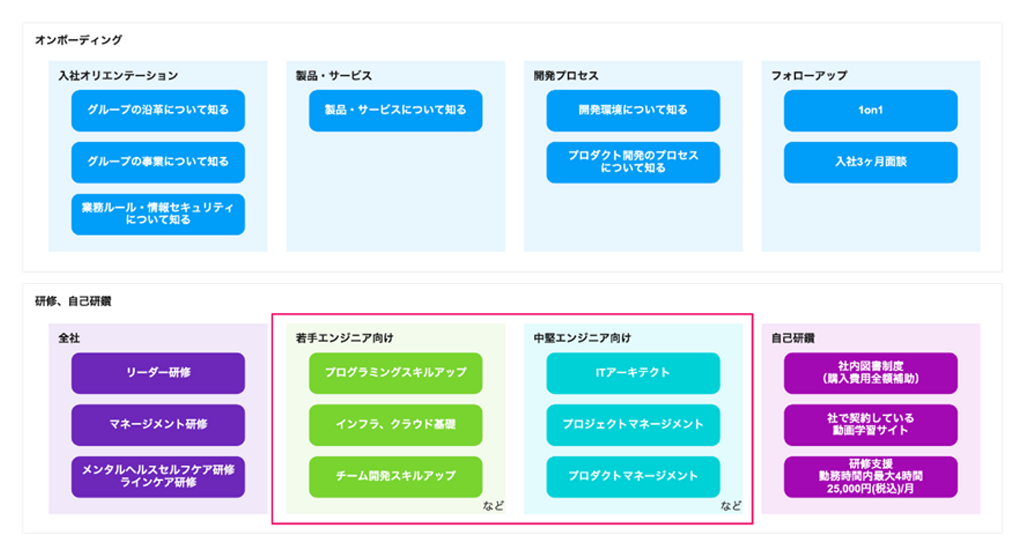 若手~中堅エンジニアを中心に、外部のエンジニア教育サービスを活用したスキルアップ研修の導入を予定しているのと、「リスキリング制度」としてエンジニアへの転向を希望するグループ社員の方(年齢要件・選抜あり)への支援も開始します。