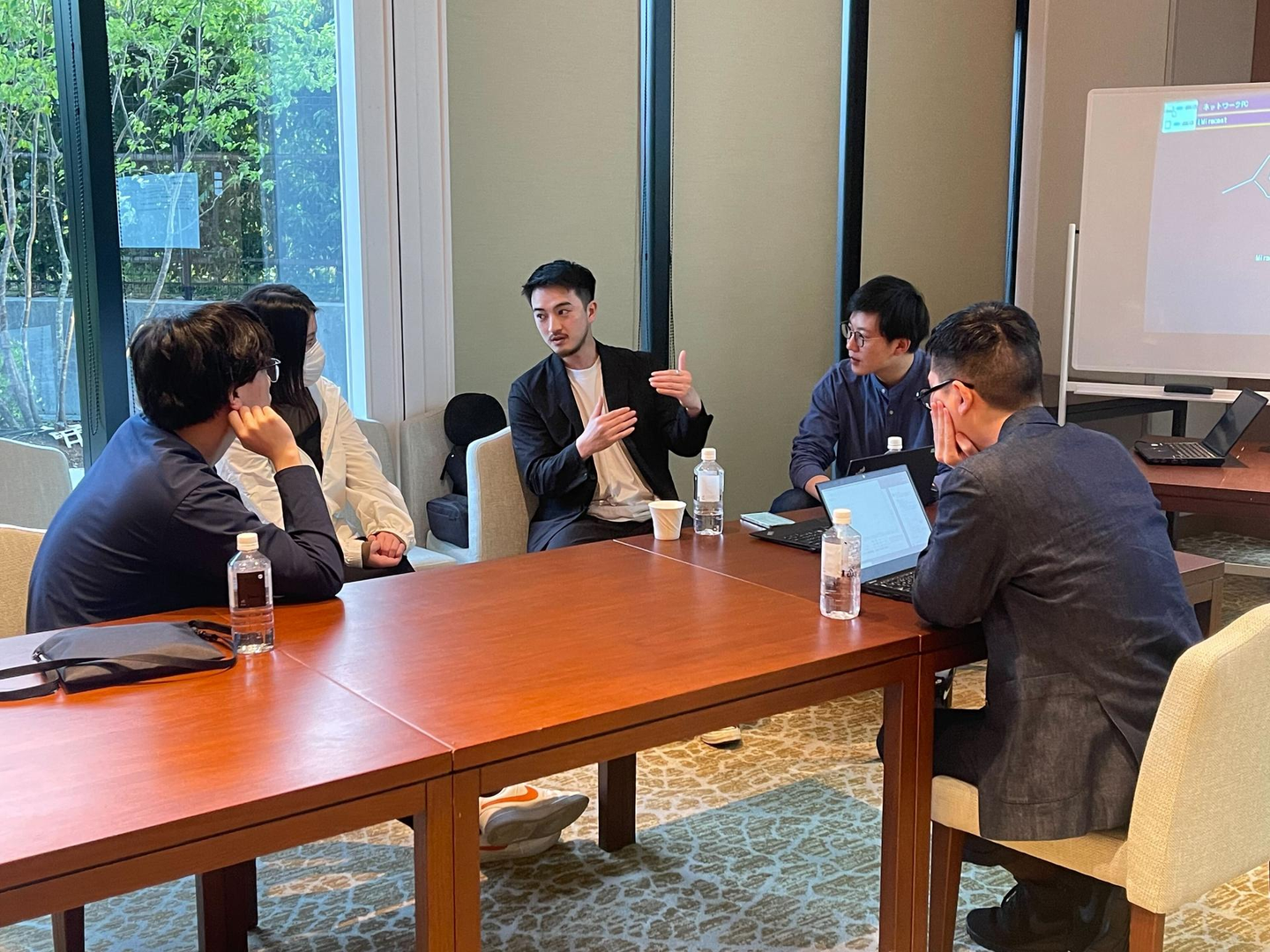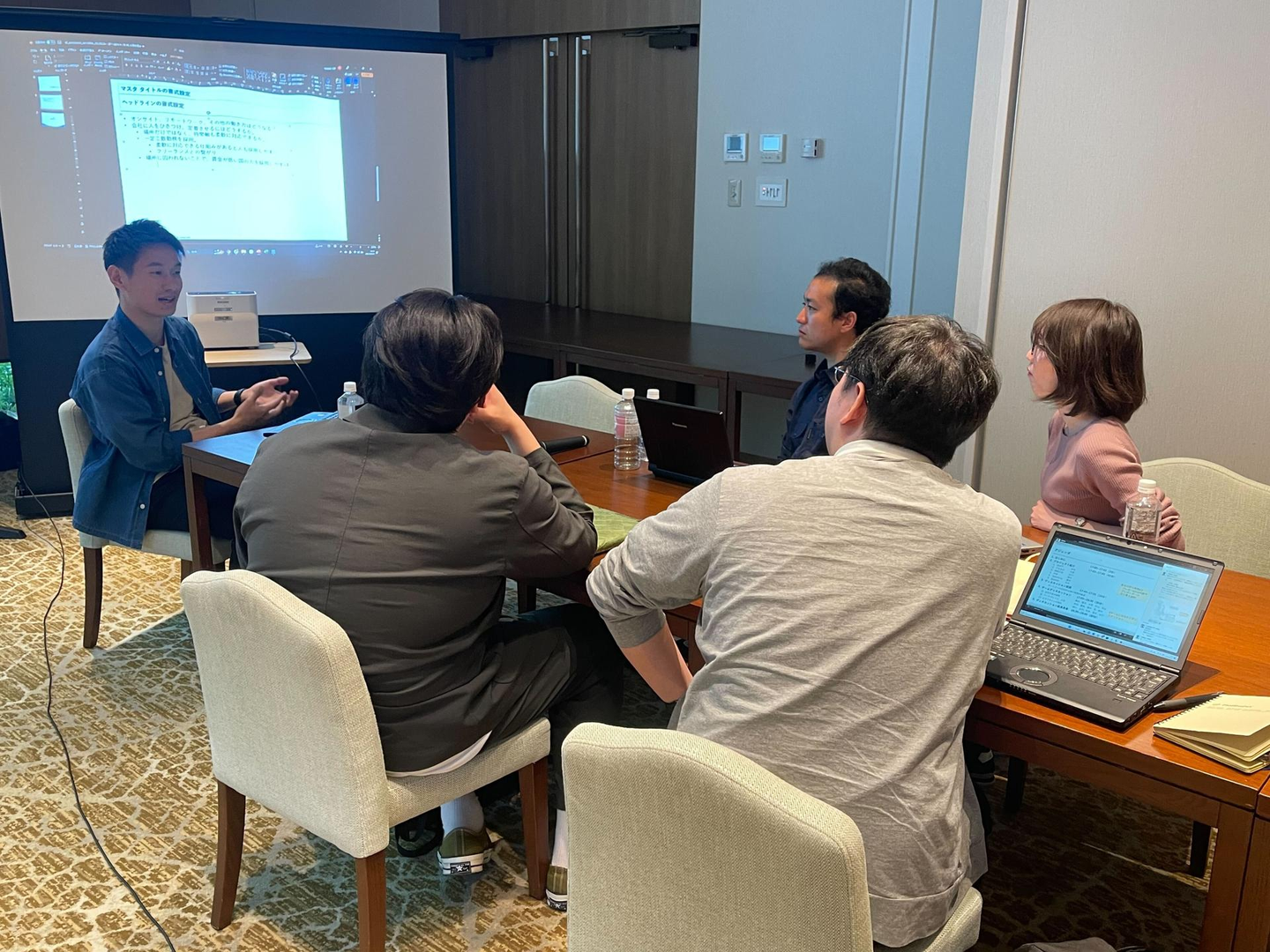 全体でホテルに集合し、ディスカッションを行いました。今回のテーマは、今後の会社としてのありかたについて。現代、AI技術の発展等により世の中は少しずつ変化しています。変化していく世の中に対して、会社はどうあるべきか、「会社の経営戦略」「人材獲得・定着」「ビズフライトの商材」について話し合いました。