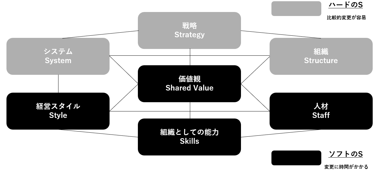 組織の成功を考える上で、道標となる一つのフレームワークに、マッキンゼーが提唱する「7S」があります。これは、組織を「戦略」や「組織構造」といった変更が比較的容易な"ハードの要素"と、「価値観」や「人材」「組織文化」といった、変えるのに時間がかかり、模倣することが困難な“ソフトの要素”で捉える考え方です。